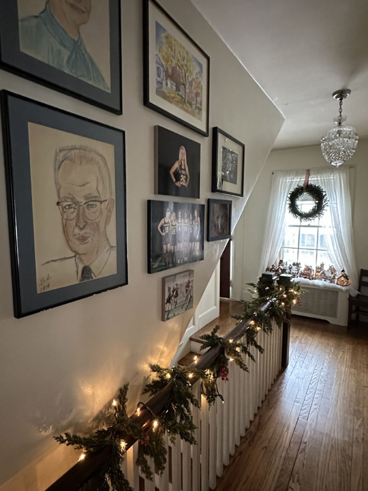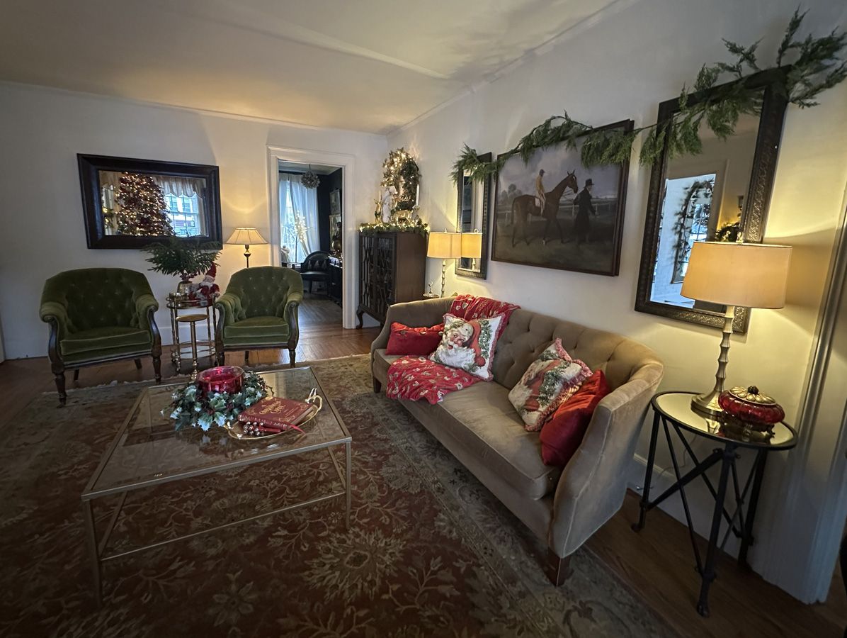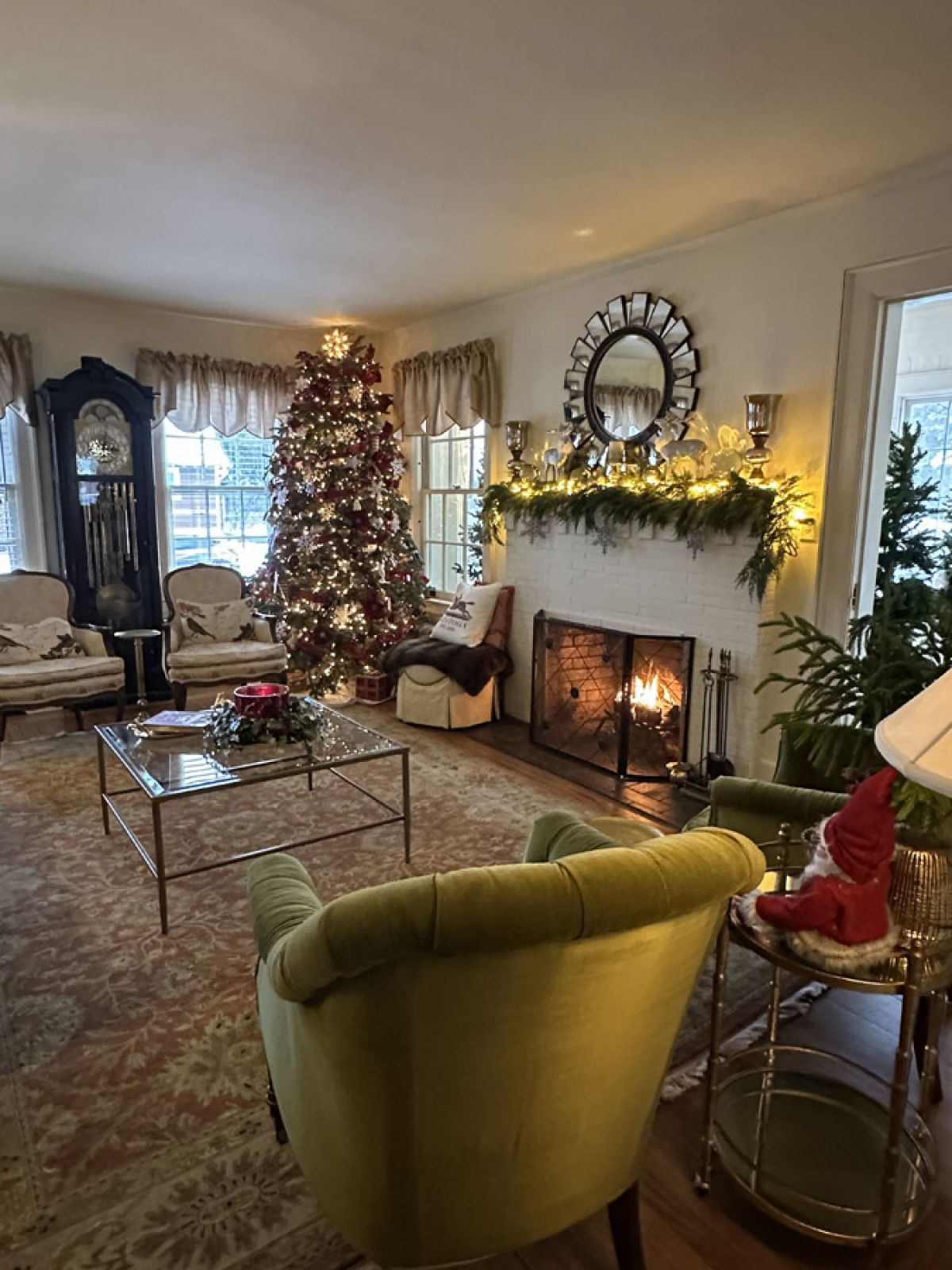 As you enter the brick house, one immediately senses the holiday spirit. Holiday cards received surround the front door; a fire is going in the living room fireplace; gingerbread houses are aglow in the dining room; and hand-carved decorations are placed throughout.