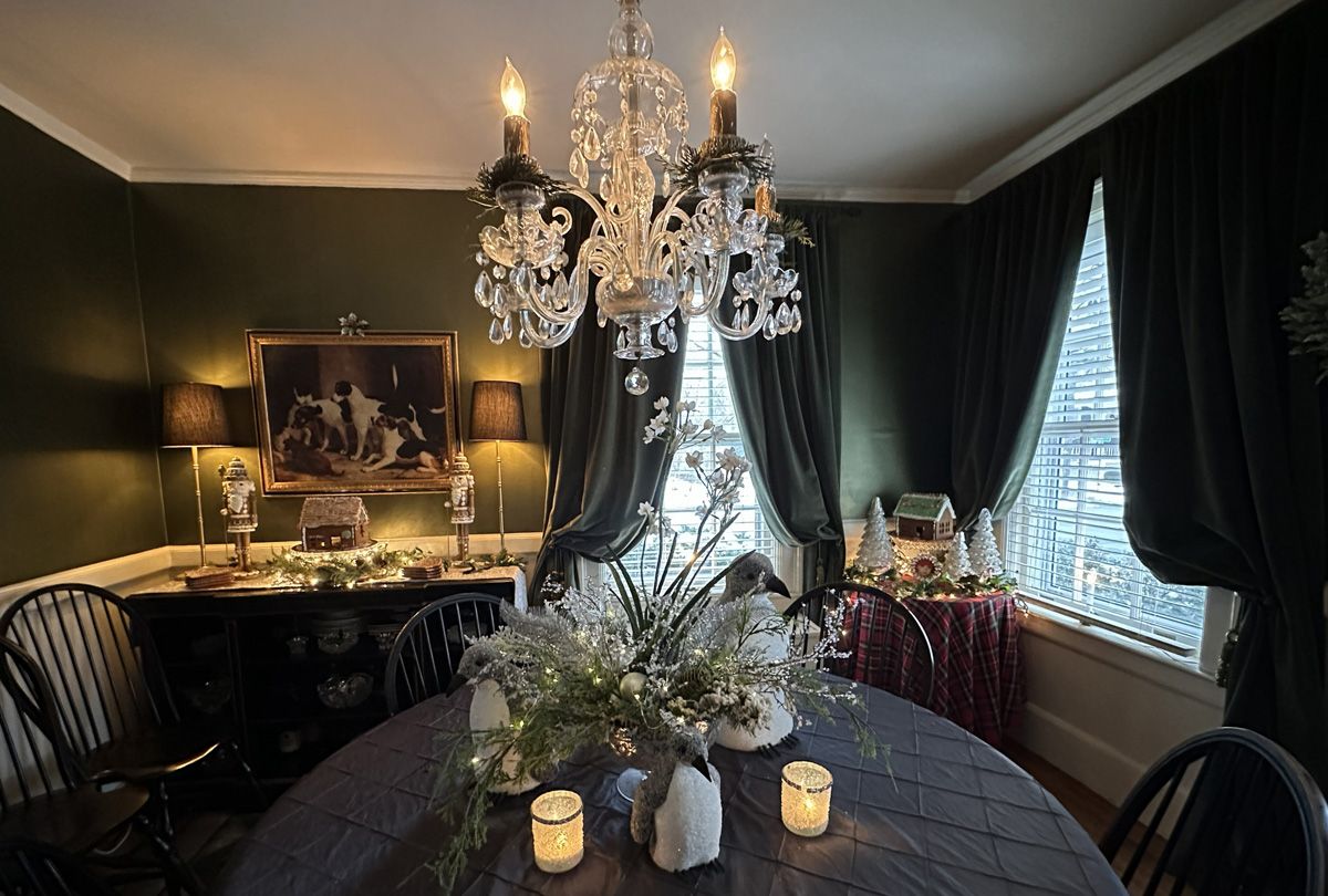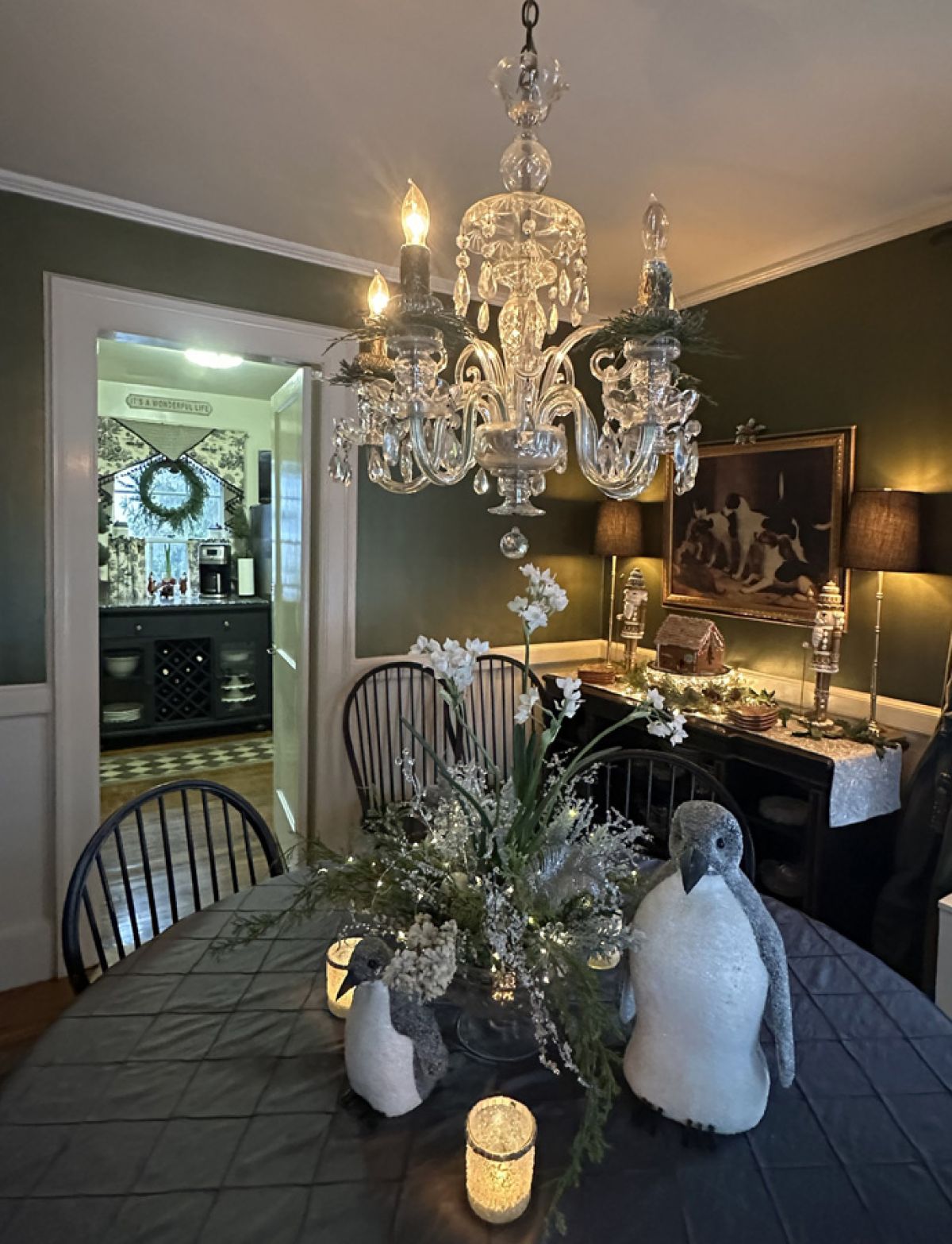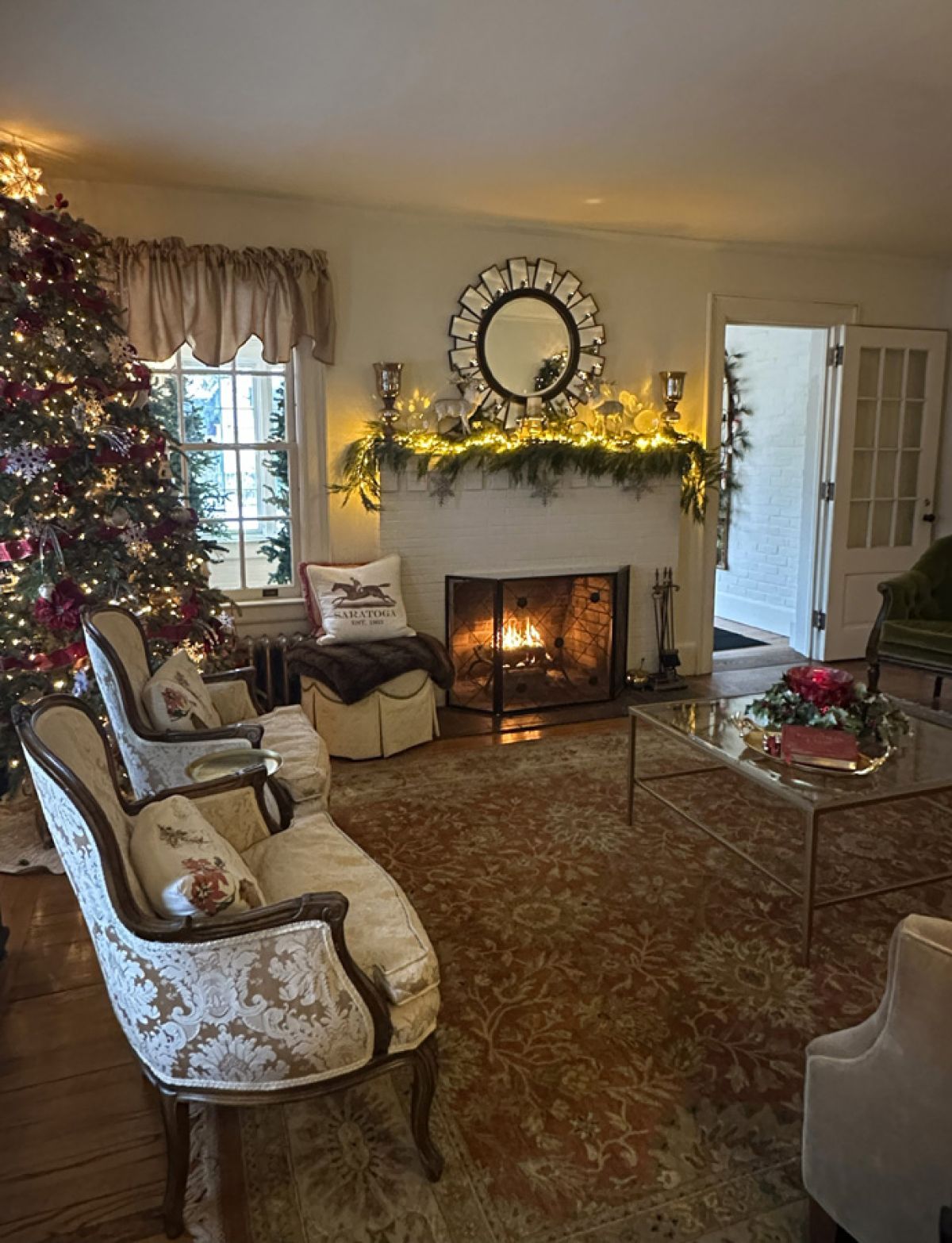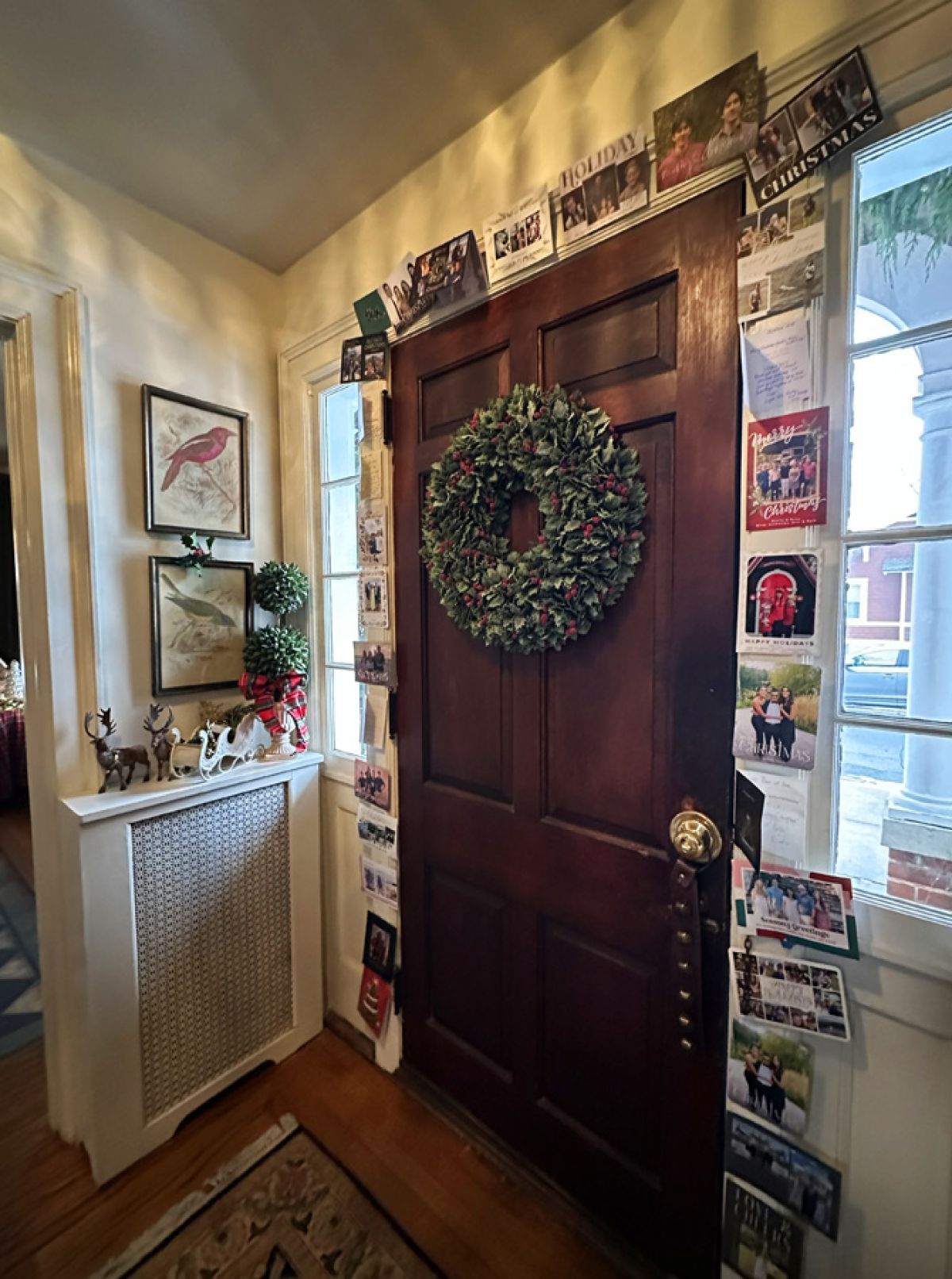 As you enter the brick house, one immediately senses the holiday spirit. Holiday cards received surround the front door; a fire is going in the living room fireplace; gingerbread houses are aglow in the dining room; and hand-carved decorations are placed throughout.