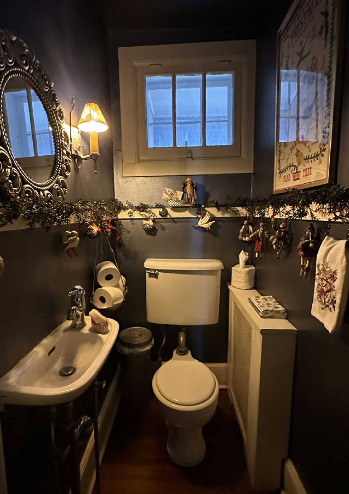 Over the years, Dan and Jessica have made repairs to the slate roof, replaced the flat roof of the garage and sun porch, installed new electrical and plumbing, as well as had custom windows made for the sunroom, replacing inappropriate aluminum storm windows. Most recently, they remodeled the bathrooms. However, they left the original bathroom on the first floor untouched.