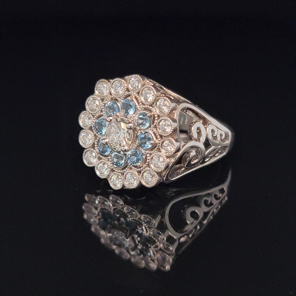 After redesign: Aquamarine setting surrounded by heirloom diamonds