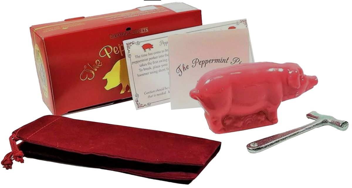 Speaking of which, my first stop will be at Impressions of Saratoga where they always have the Peppermint Pig Noel Kits. Traditionally, these pigs represent good health, happiness and prosperity… Mr. Potter will really appreciate that! The kit includes the peppermint pig, a mallet and bag to break the pig in. Potter can either get some frustration out or hammer away wishing for more prosperity! Either way…it’s a perfect gift for someone who has everything! And if you only need a pig…they have that as well! Now, you all know Clarence Odbody loves bells. And…Wait till you see this Amish Hand Crafted Red Leather Strap with Solid Brass Bells and Horse Medallion! A one-of-a-kind gift for a one-of-a-kind angel! Tethered with eight different sized solid brass bells in descending order, I’m sure plenty of second-class angels will find their wings when he shakes this up a bit! And you know how Ernie Bishop loves to drive his taxi about town…well, I thought maybe he would get a kick out of this Truck Snow Globe giving a few pups a ride instead. Operated by batteries or plugged in, he and his family will love the soft glow it gives and the cheeriness of the pups with Santa! And look what I found for Violet Bick…a Mini Clear Calista Handbag with Interchangeable Bow! She won’t have to worry about taking her bag into SPAC concerts anymore and she will definitely love being able to change out her bows as often as her hats!