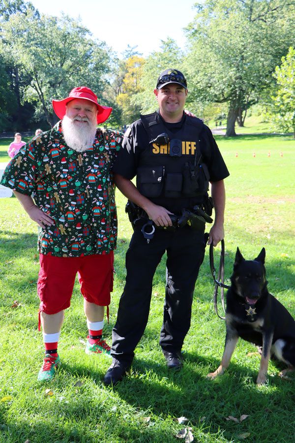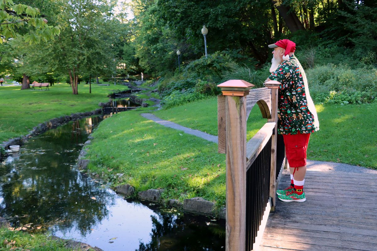 I meet Nick at Congress Park on a Saturday morning, and he comes in a summer outfit; Santa sneakers, Santa socks, a Christmas-themed shirt, red shorts, jingle bells, a bag of coins to hand out, and a HoHoHo for anyone passing by. “You know it’s a few months away, right?” someone asks. “I’m on vacation,” Santa replies, his eyes twinkling.