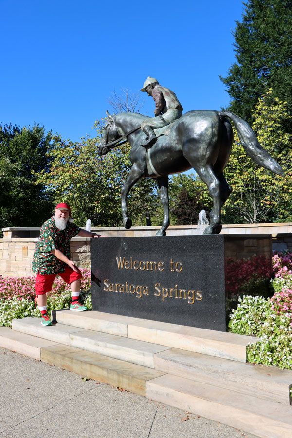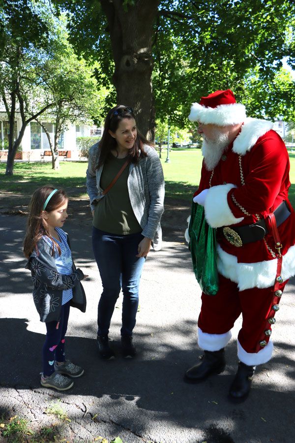 After a while, Santa changes into his December outfit. We’re busy taking photos with groups of people visiting Saratoga, a Sherriff, and his pooch, and at the fountain with Spit and Spat when a lone man walks over to us.