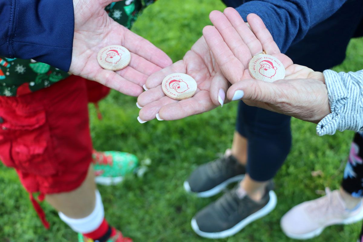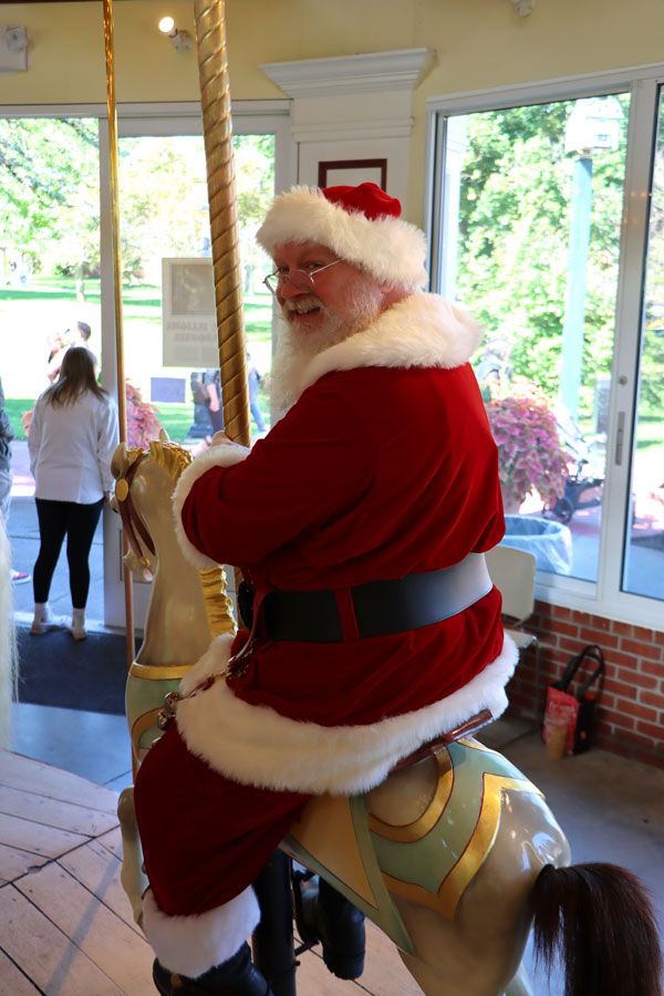 Nick shares that he’s never been on the carousel here in Congress Park. I’m shocked! I tell him we must change that as we make our way to the ride. Out of the corner of my eye, I can see two young girls with their mom. One steps closer to her mother’s side and grabs her hand. The other one? She yells, “Santa Claus! Mom, that’s Santa Claus!” I watch her barreling towards us, arms out wide. She careens into Santa, wrapping herself around his legs, giggling the whole time.