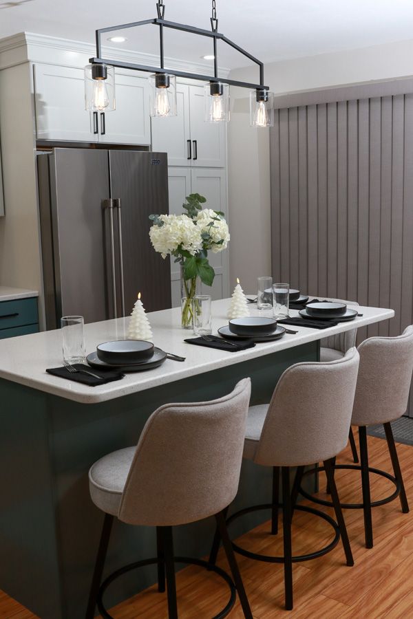 During a previous remodel, the original kitchen island had been removed. Now, both Jeanne and Jim are overjoyed to have a welcoming new center island (and its four upholstered swivel stools!) as the focal point of the light and airy space.