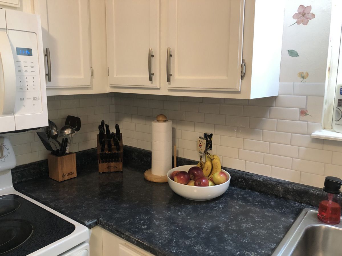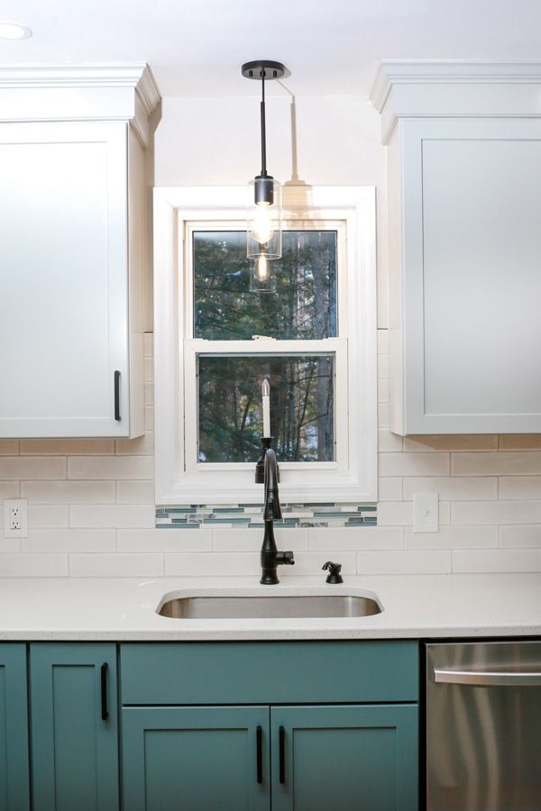 After struggling with backsplash choices, the Daleys decided on a classic white subway tile highlighted by decorative sea glass tiles in jewel-like hues. Illuminated by recessed lighting and pendent lighting, this kitchen shines!