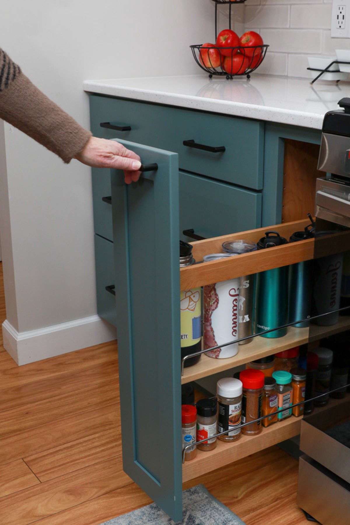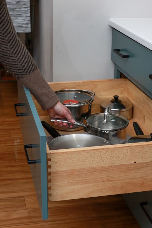 “I love the island! It’s really cozy. I’m so glad to have it back,” said Jeanne. “It’s my favorite thing in the space.” Within the island there is room for a pull-out garbage and recycling station, bakeware, a large collection of cutting boards, and extra deep drawers for utensils and cutlery.