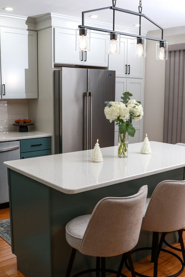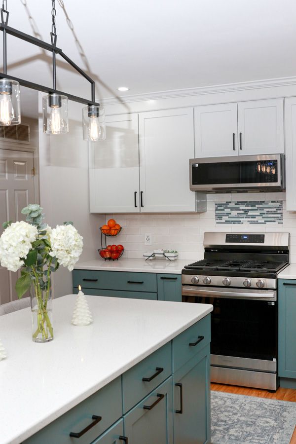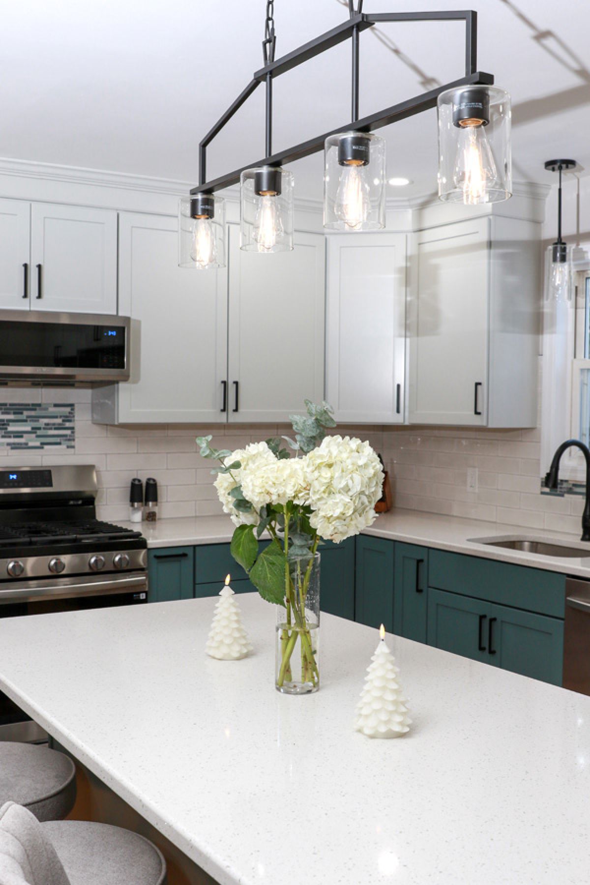 By removing the kitchen’s soffit, the light mint green wall cabinetry was extended, creating a more open look that optimizes storage while creating a calming feeling that complements their existing wall color. The base cabinetry’s slightly darker tone adds a more dramatic moodiness to the kitchen that still pairs exceptionally well with the home’s existing natural hardwood floors and new no-maintenance white quartz countertops.