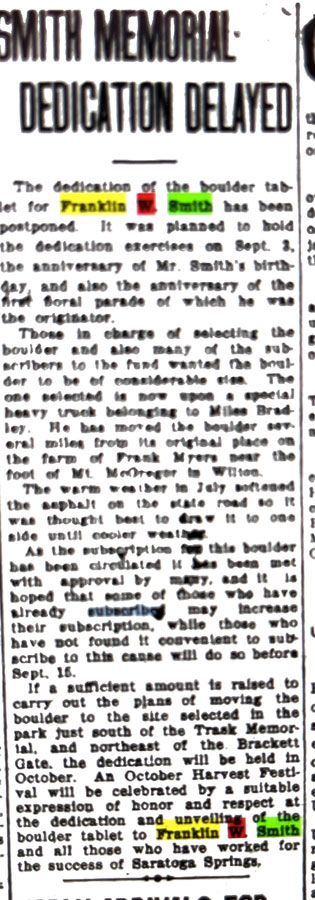 In 1917 a group of citizens wanted to memorialize Smith for his efforts and planned an inscribed plaque to be dedicated in his honor in Congress Park. To my chagrin, this never happened.
