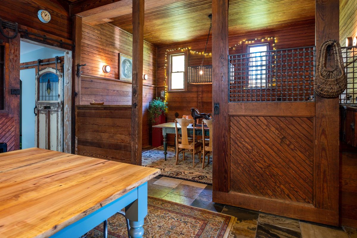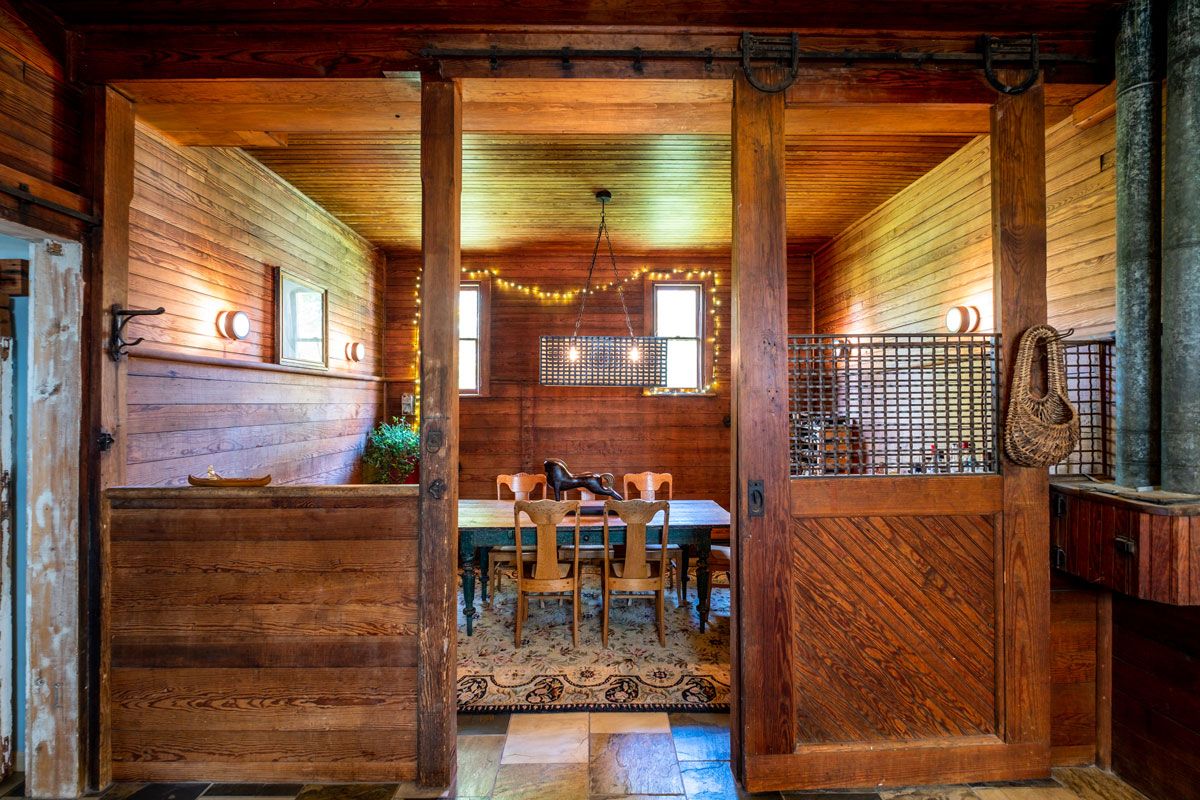 When arriving at the home, Michele took note of the several large original barn doors throughout the space, including one with an iron grate that closed off a wood clad stall, now the formal dining area.
