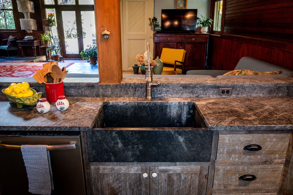 The only new “appliance” incorporated into the kitchen is the custom soapstone farm sink from Vermont Soap Stone, that melds perfectly with the new soap stone counter tops on the perimeter of