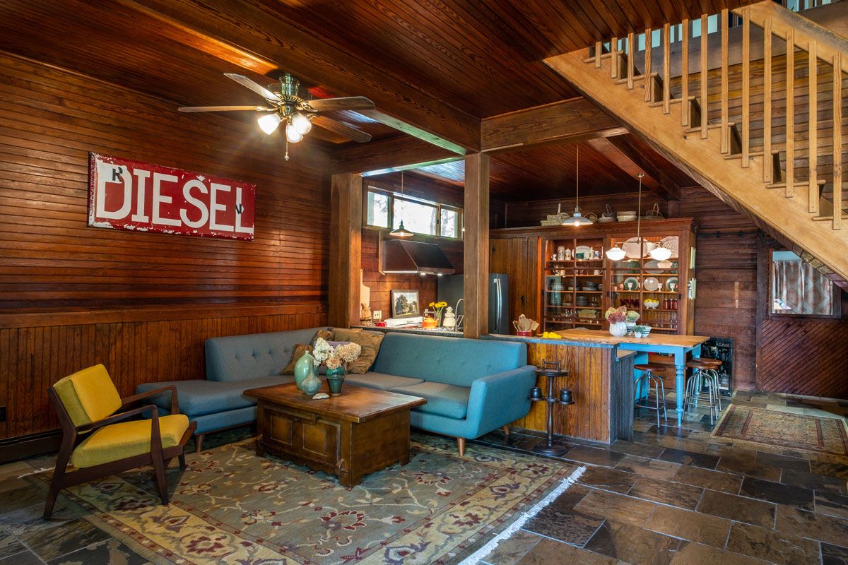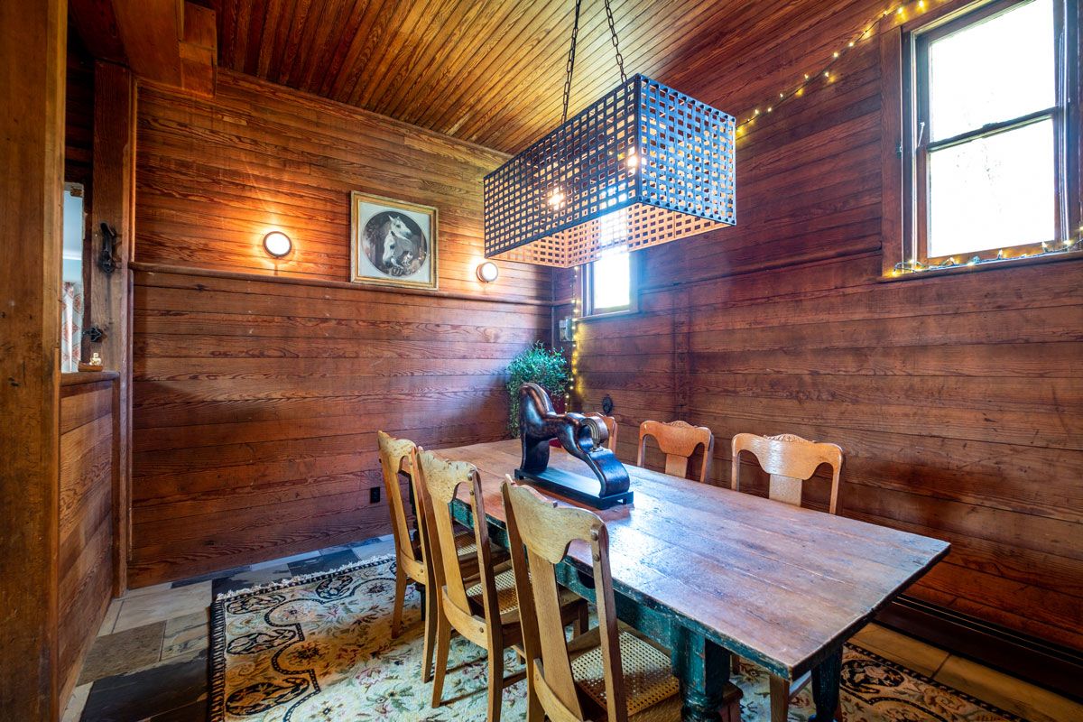 Up above was the original hay drop, now an overhead light with mid-century glass. The entire first floor is slate tile with radiant heat.