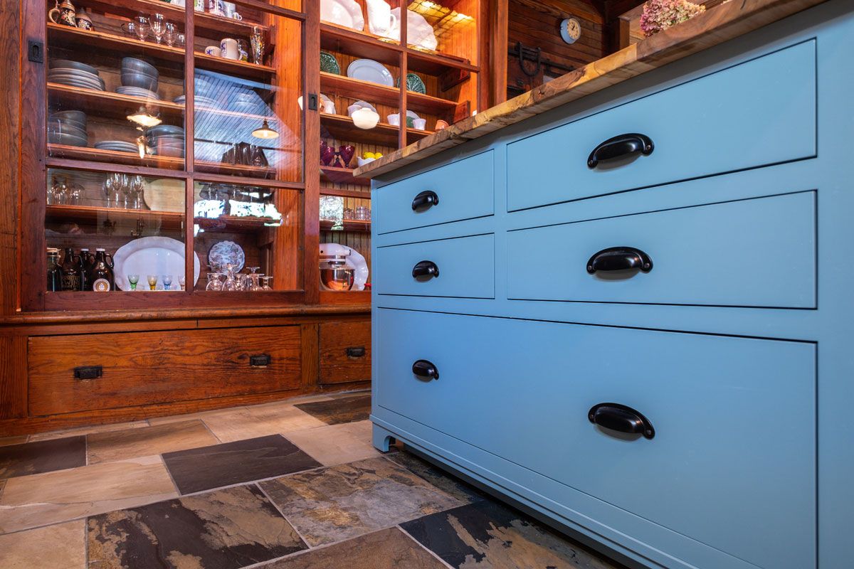 When designing the island, Michele wanted to mimic the legs of their dining table, and Chris was able to accomplish this perfectly! The back of the island has large deep drawers that sit across from the range for pots and pans, a garbage pull on one side of the island and drawer storage on the other side, all finished off with tongue and groove beadboard. Michele suggested a blue green for the island, and they settled on a color by Benjamin Moore called “Waters Edge.”