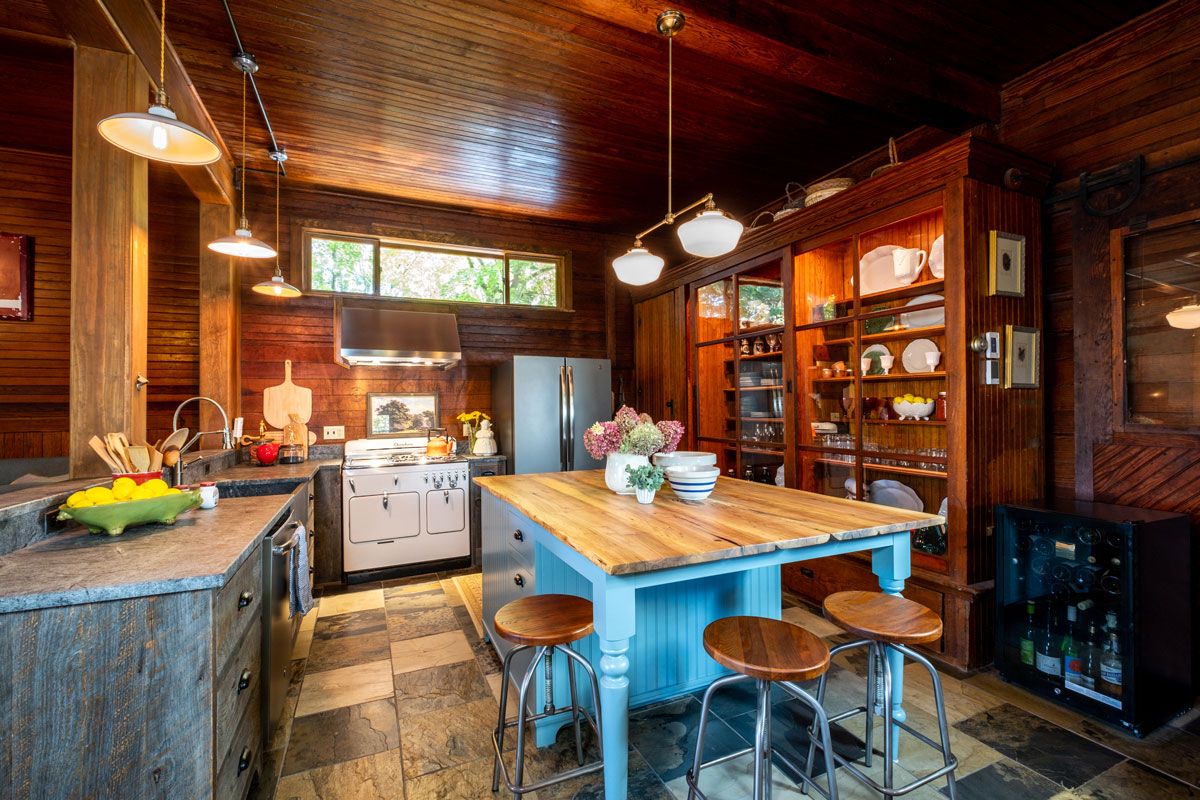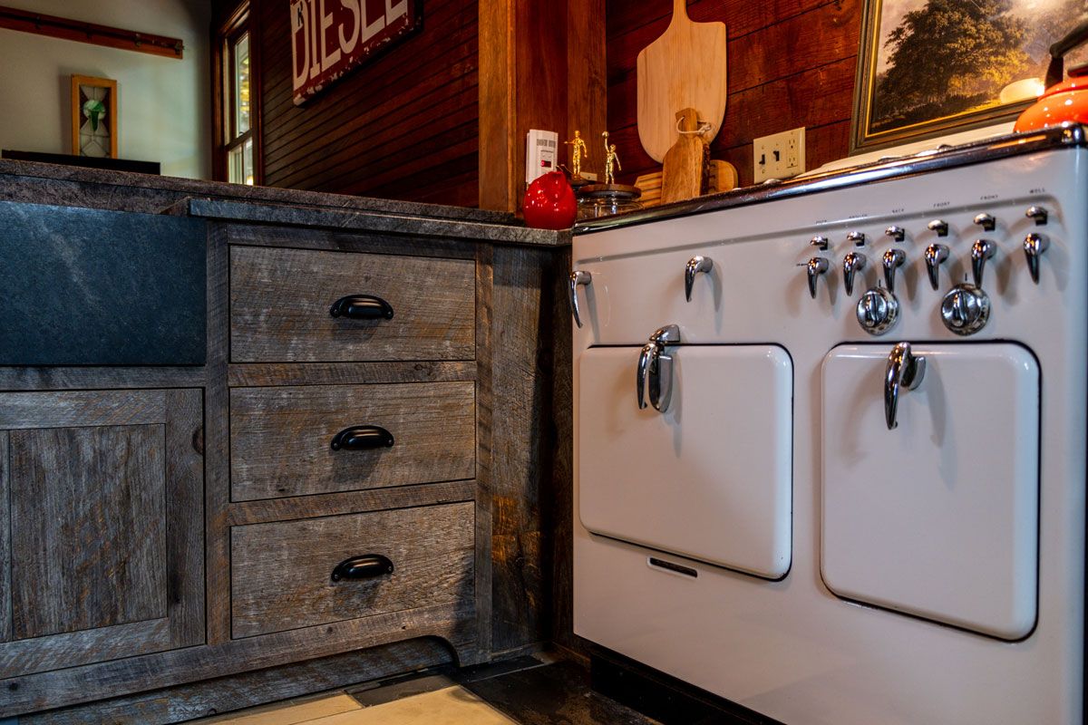 The lower cabinets on the perimeter have rough barnwood inset drawers and doors, and Michele designed a few pull outs for the interiors to add additional storage. On the back wall of the kitchen sits a large antique glass storage cabinet which was incorporated into the overall design.