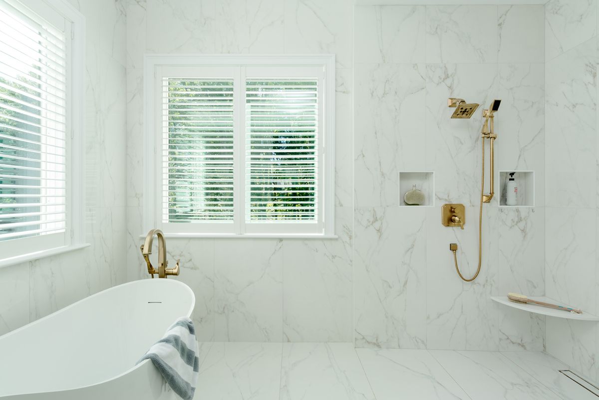 Wet rooms are all the rage today, and this gleaming example, with its convenient built-in shelving, waterfall showerhead, and almost-invisible glass enclosure, boosts the bathing ritual with a tub and shower that flow together so seamlessly that it creates a spa-like experience.