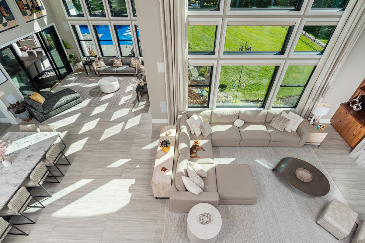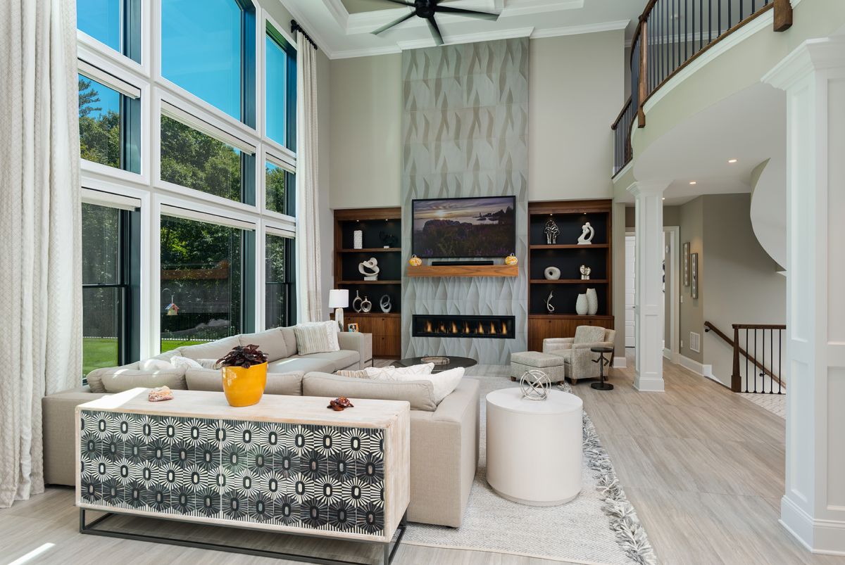 By pairing two design trends, modern and traditional, Plum and Crimson used juxtaposition to create an intriguing interior. Light from the floor-to-ceiling windows floods the great room’s large expanse of tiled flooring. Hand-crafted walnut shelving by Justin Steinberger of Washington County’s Steinberger Woodworks flanks the natural gas fireplace. Interesting vertical patterned tile encourages the eye to travel, taking in the columned balcony and a graphic tray ceiling that ups the room’s elegance factor.