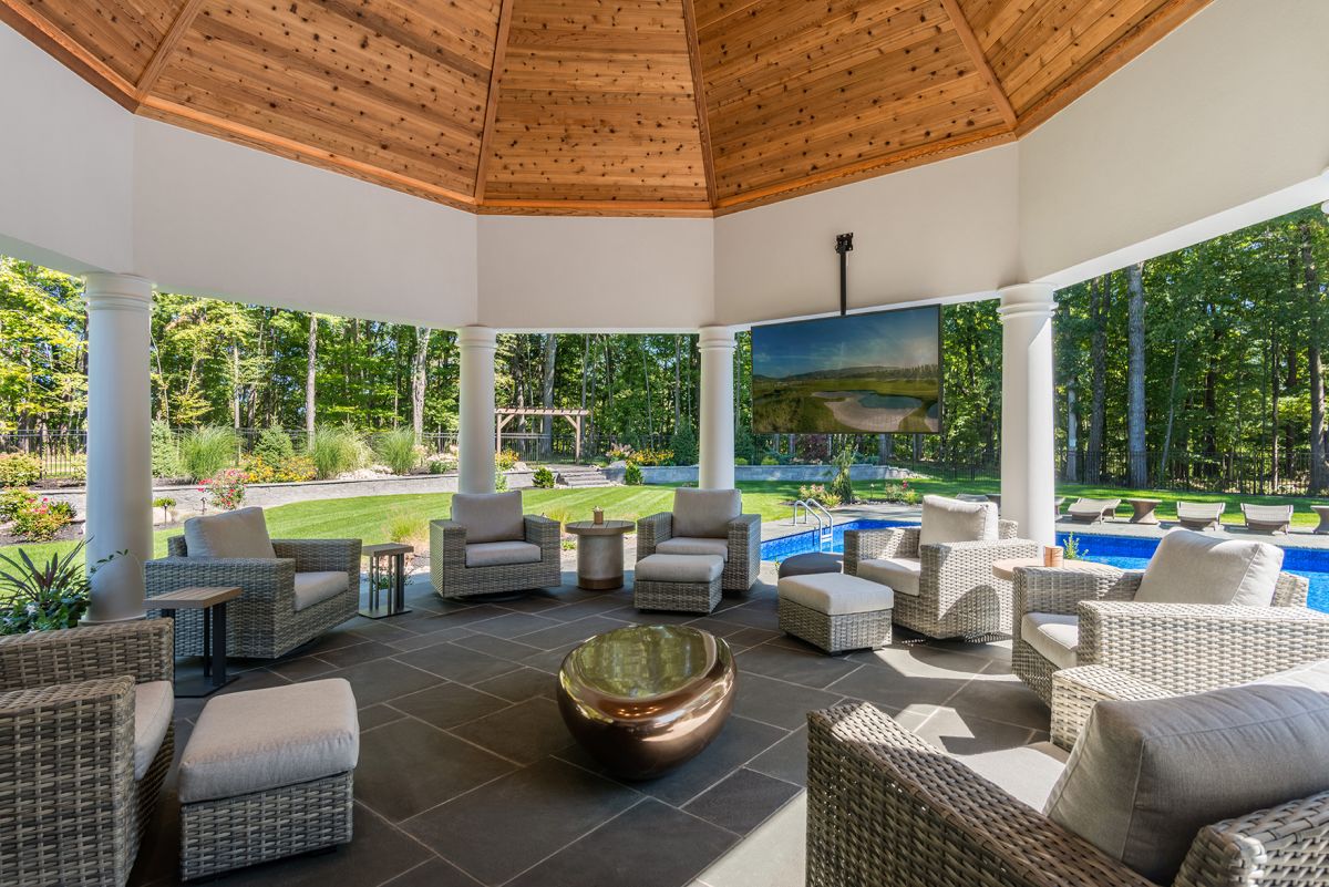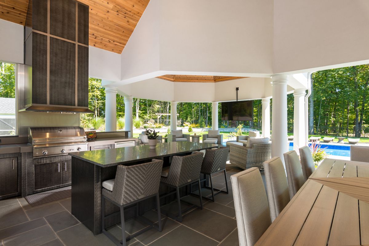Under the peaked patio roof, a cedar ceiling warms a seating area centered around a gorgeous copper table resting on a large format slate tile floor. Steel grey granite countertops, a weather-resistant hood and metal cabinetry introduce the modern aesthetic, while the adjustable ceiling-mount television allows for easy viewing no matter where you are, indoors or out.