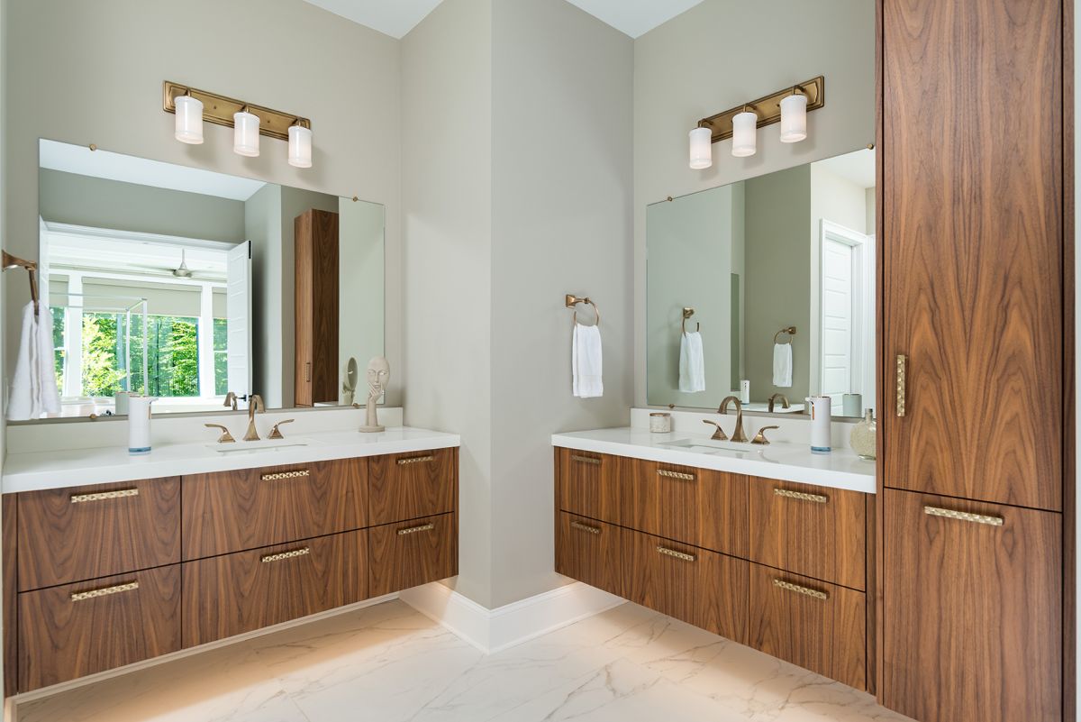The spacious and modern master bathroom features heavy-duty ceramic tile made to look like marble across the floor and wet-room walls. Sleek natural cherry cabinetry, under-cabinet lighting, and gold hardware jazzes up a pair of floating vanities for a look that is both attractive and practical.