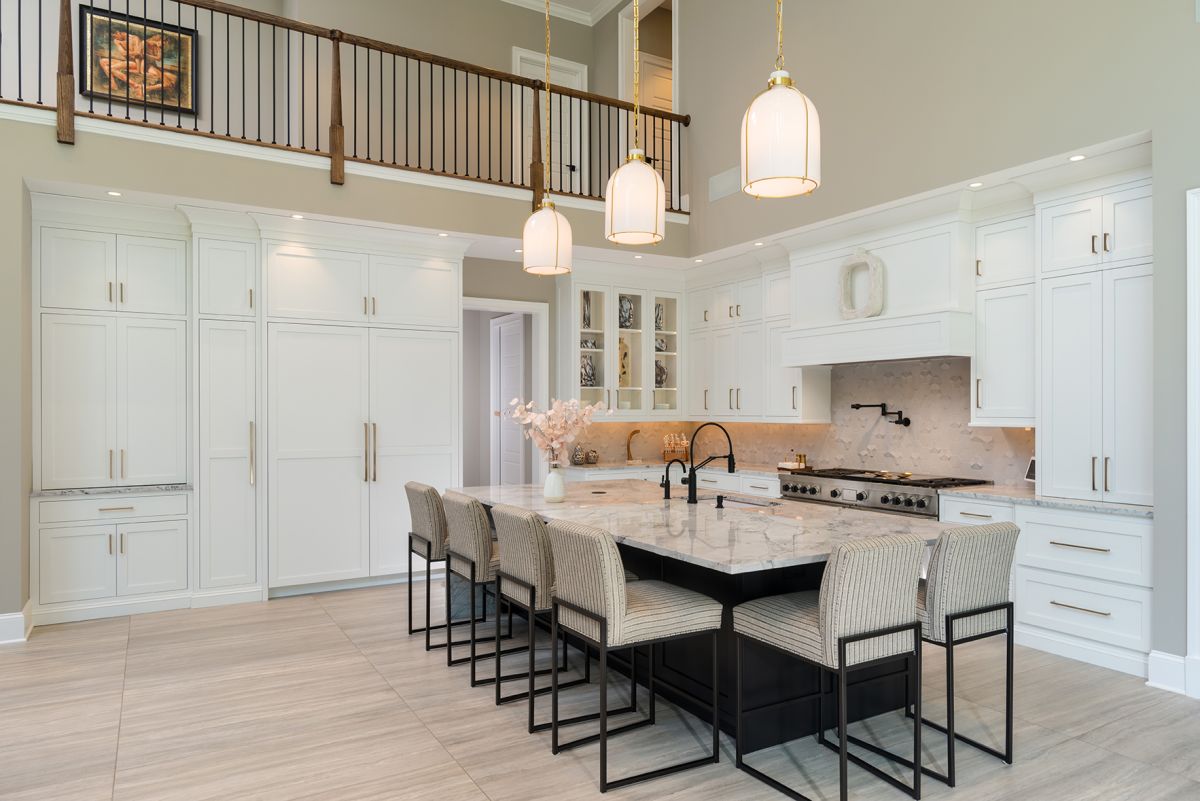 Cabinetry painted a solid white shows off the kitchen’s detailed craftsmanship and generous lighting while keeping everything neatly tucked away out of view. The attractive and durable quartzite countertop complements the preparation area, where a double oven and 3D tiled backsplash transform a wall into a work of art.