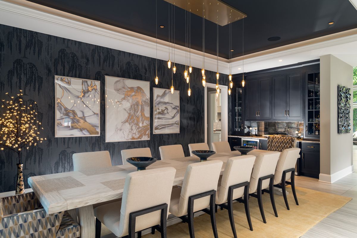 The excitement of a dark dining area and beverage bar adds visual weight to the voluminous space. The antique glass mirror backsplash and dots of twinkling light make a dramatic statement while a trio of paintings introduce a touch of gold’s dignified grace.