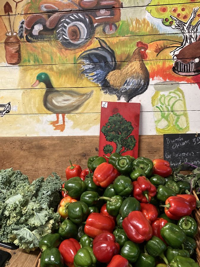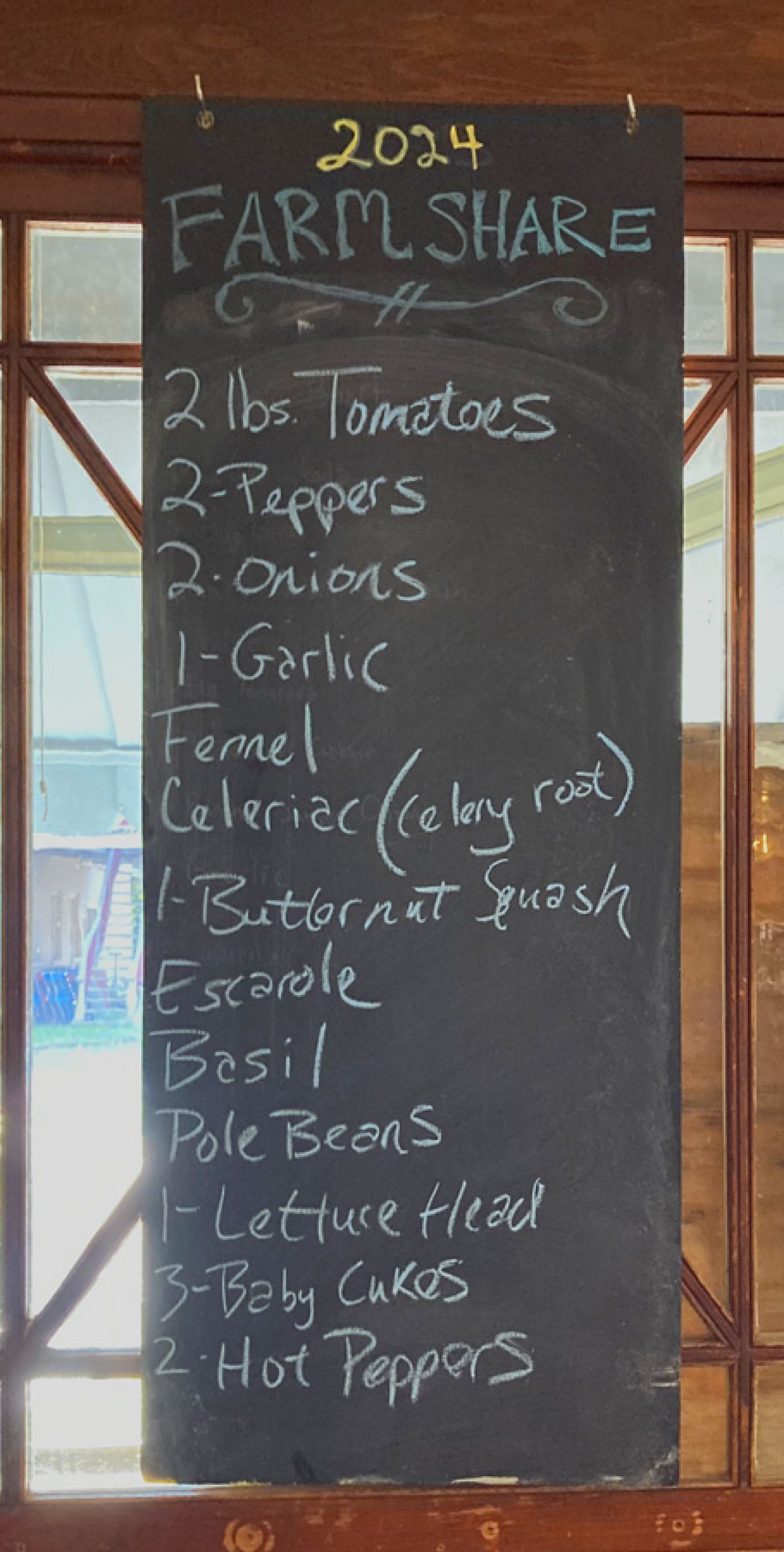 Weekly farm share items are listed on a chalkboard.
