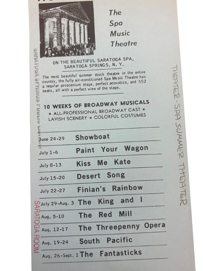The building has always been the state-owned Spa Little Theater, but programs often billed it under different titles depending on the producing company. Over the years, playbills billed it as the Spa Music Theater, the Spa Summer Theater, the John Houseman Theatre, or Home Made Theater. These weren't official name changes, but rather reflections of the companies and productions that came and went inside its walls.