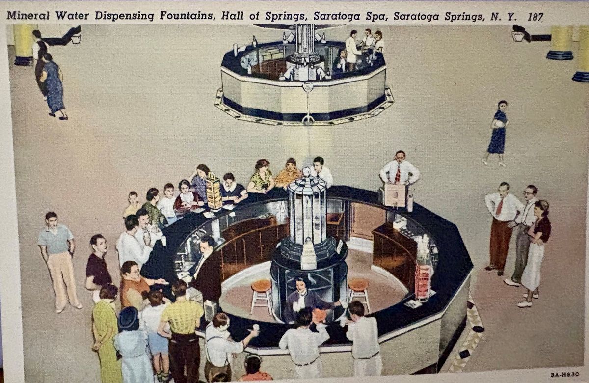 This postcard illustrates the Hall of Springs in 1935 and shows the “ three circular yellow marble fountains, from which well Geyser, Hathorn and Coesa waters. Patients and visitors fill glasses at the fountains, stroll through the arcades sipping and gossiping until the waters work. An orchestra plays in a balcony.”
