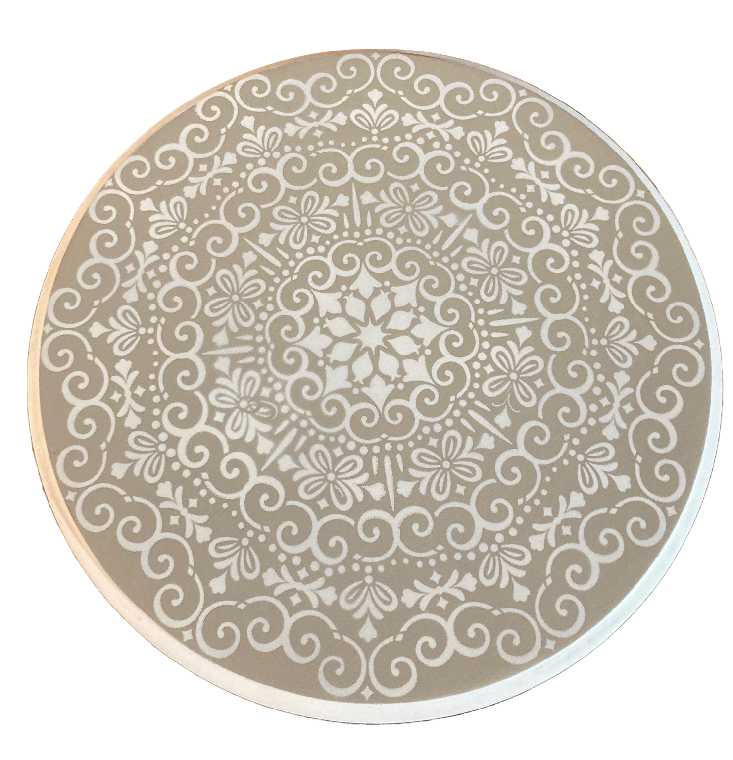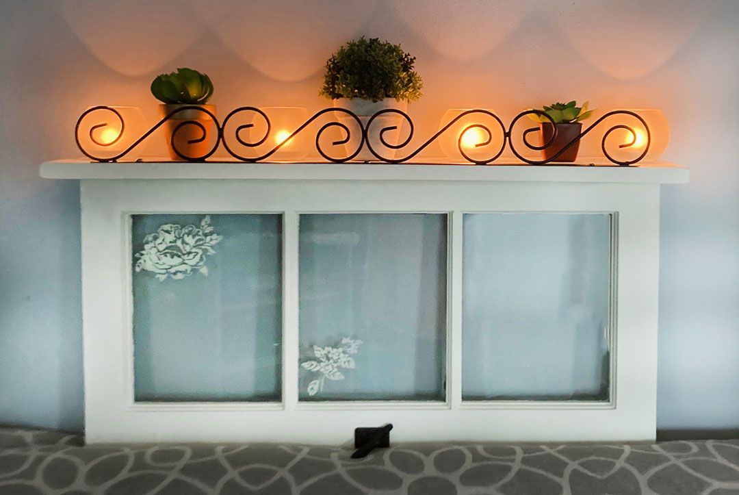 On some tops, delicate edge ornamentation still peeks out even when covered with tableware. On others, stencils create a painted tablecloth base for even more texture once place settings are added. To repurpose a three-pane window into a compelling shelf, Lisa added wood, metal accents, and stenciled flourishes onto the glass.