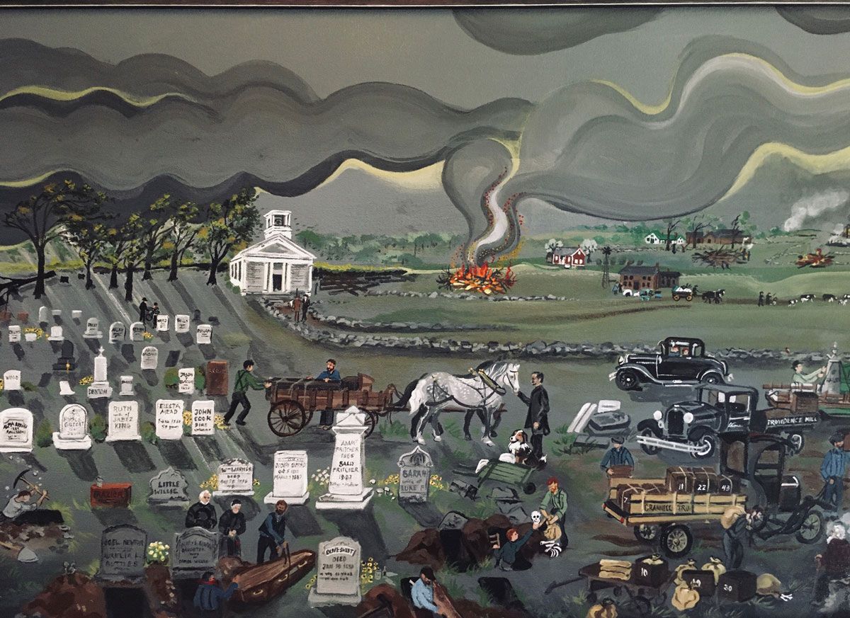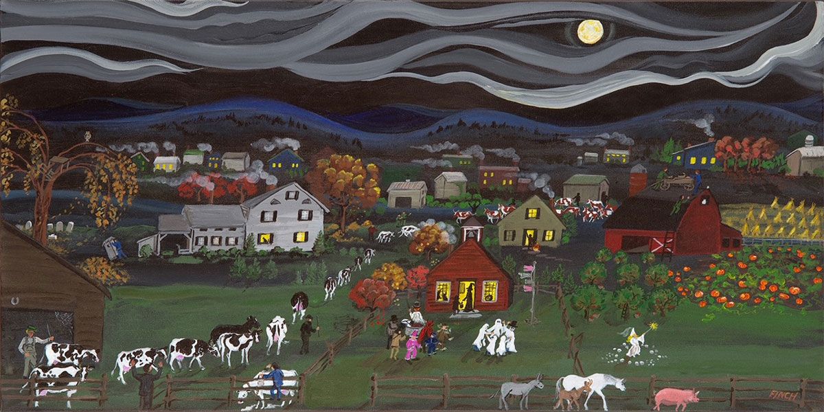Although well-known today as a folk artist, Finch is actually an Impressionist painter at heart. From June through September, she organizes and leads plein air sessions (painting outdoors in daylight) at local scenic sites, offering artists an opportunity to pursue their passion beyond their studio walls in the presence of other like-minded individuals. In 2004, Finch turned to folk art painting in earnest when—in response to an environmental issue of critical importance to her then-hometown of Sullivanville—her civic and artistic focus shifted to fracking. After witnessing first-hand the dire effects of fracking on her rural community, Finch created 17 paintings to more fully educate people about the disturbing effects of the process. In doing so, she referred to herself as “an environmental activist, trying to squeeze 1,000 words into every picture.”