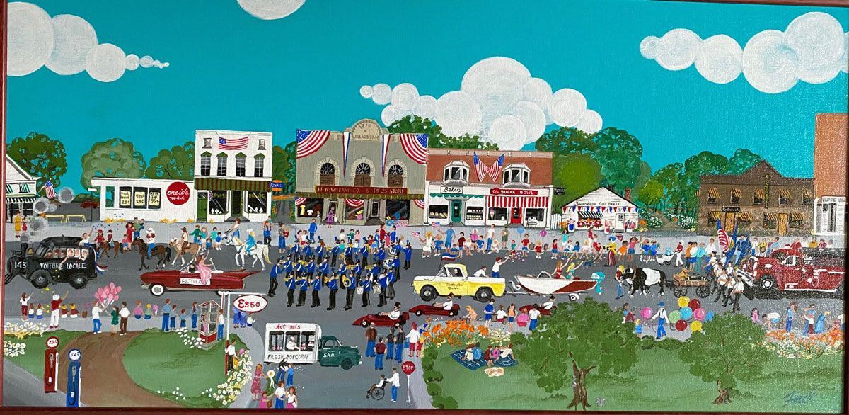 Using eye-popping carnival colors, Finch creates works so vibrantly detailed you could spend hours studying just one and still not catch every nuance. Available as giclee prints on presentation paper or canvas, every scene provides a visual feast as well as a fascinating history lesson. On her website, the artist narrates the stories behind many of her Sacandaga paintings in a video titled, “Linda Finch Adirondack Folk Art Exhibit.”