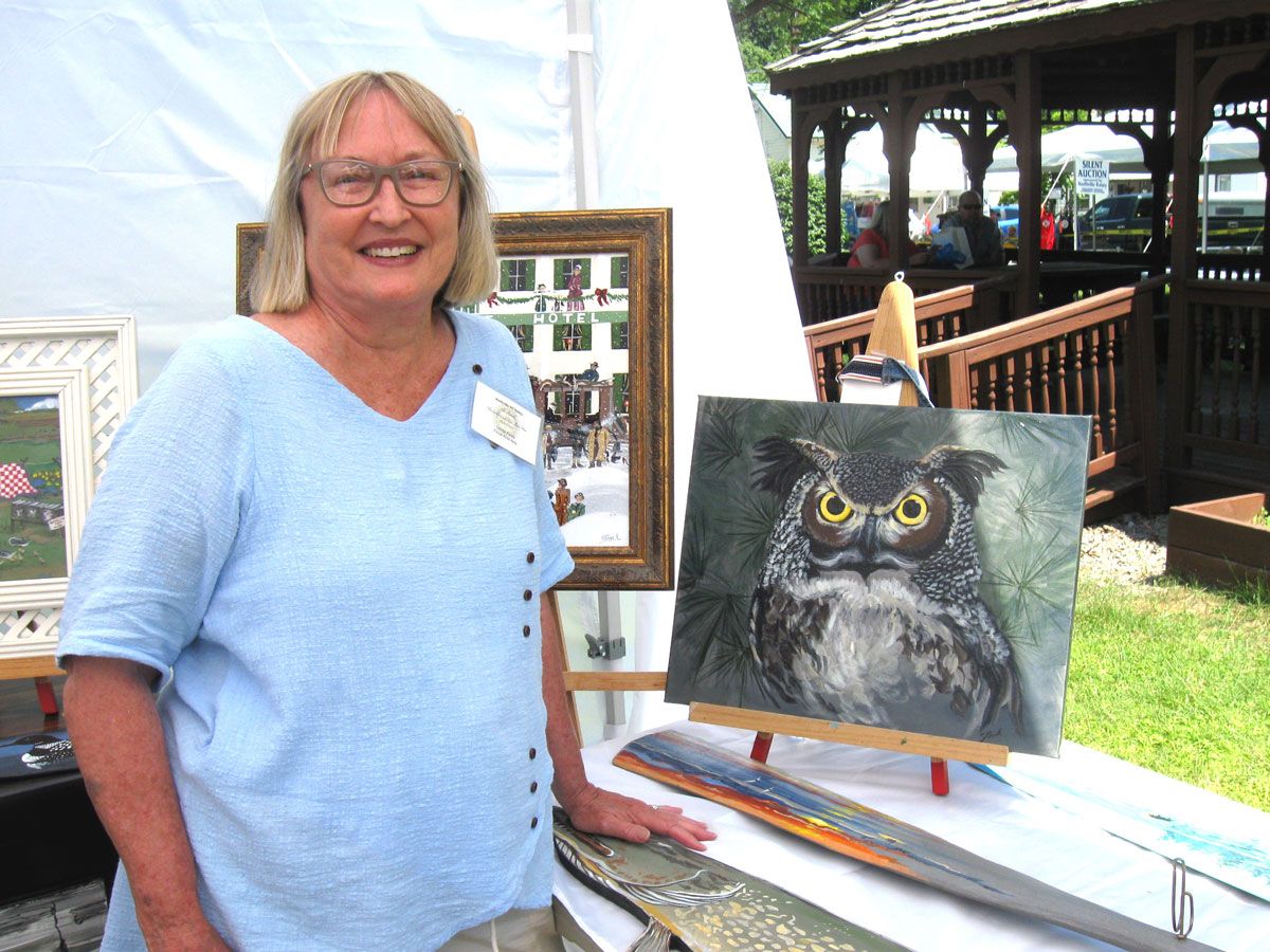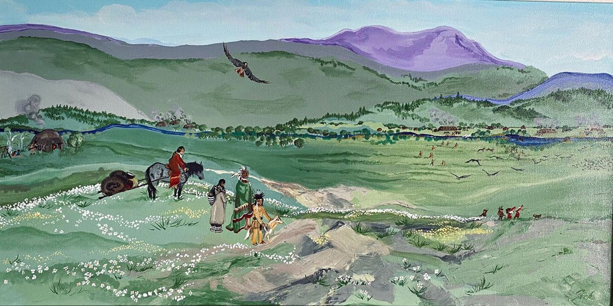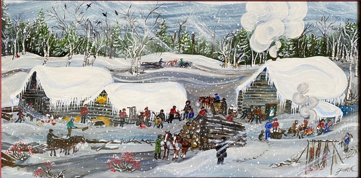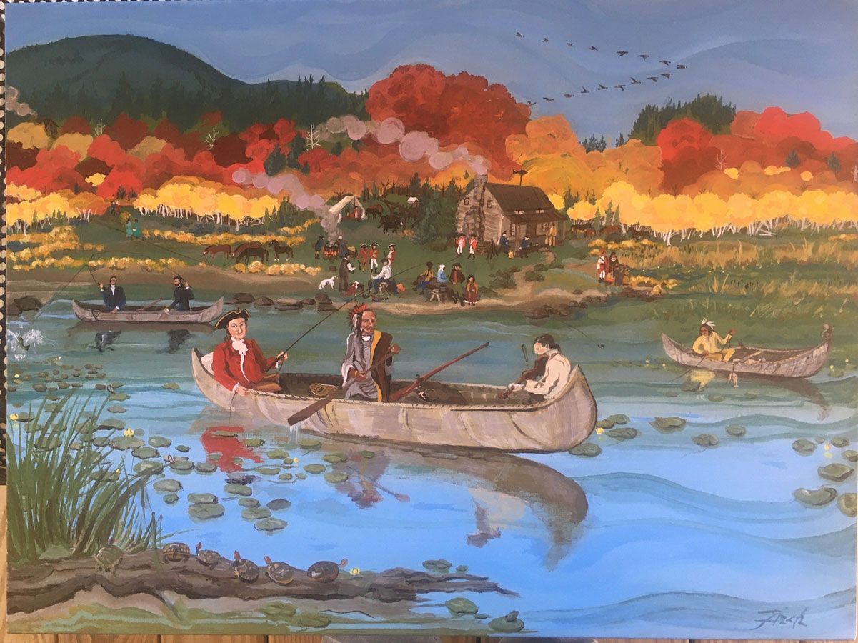 Upon returning to Northville in 2017, Finch noticed that, with the passage of time, fewer and fewer residents and summer visitors were aware of the Sacandaga Valley’s rich and storied past. Determined to preserve its history by sharing the wealth of local information she’d acquired over her lifetime, Finch set about painting a series of scenes depicting key places and events from the valley’s past. Initially, she painted a triptych (three related works), after which a grant from the New York State Council for the Arts partially defrayed the expenses of eight additional paintings. But the artist soon realized that she had many more stories bottled up within her, begging to be told.