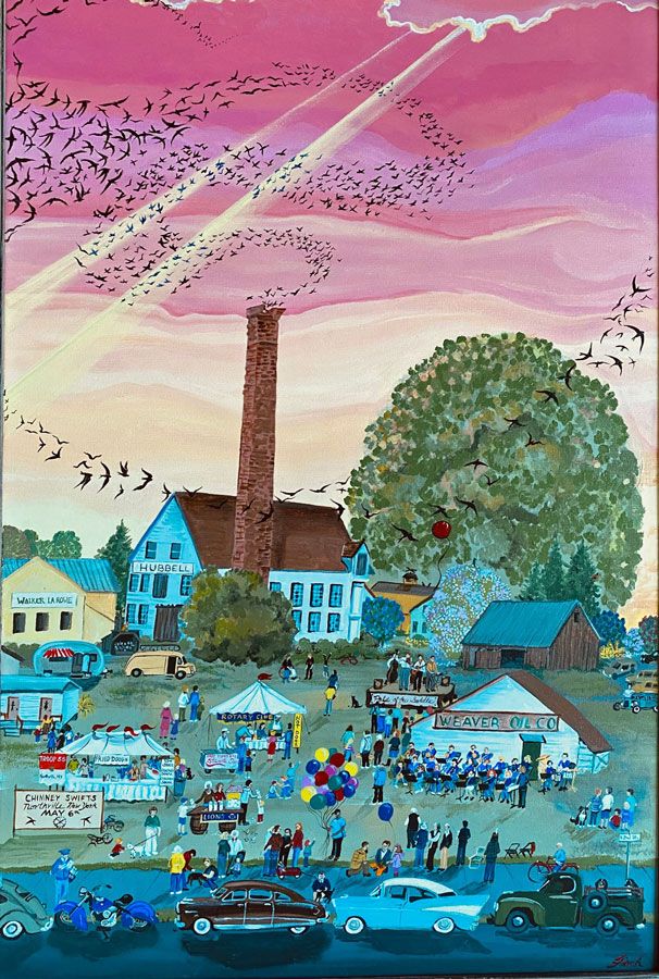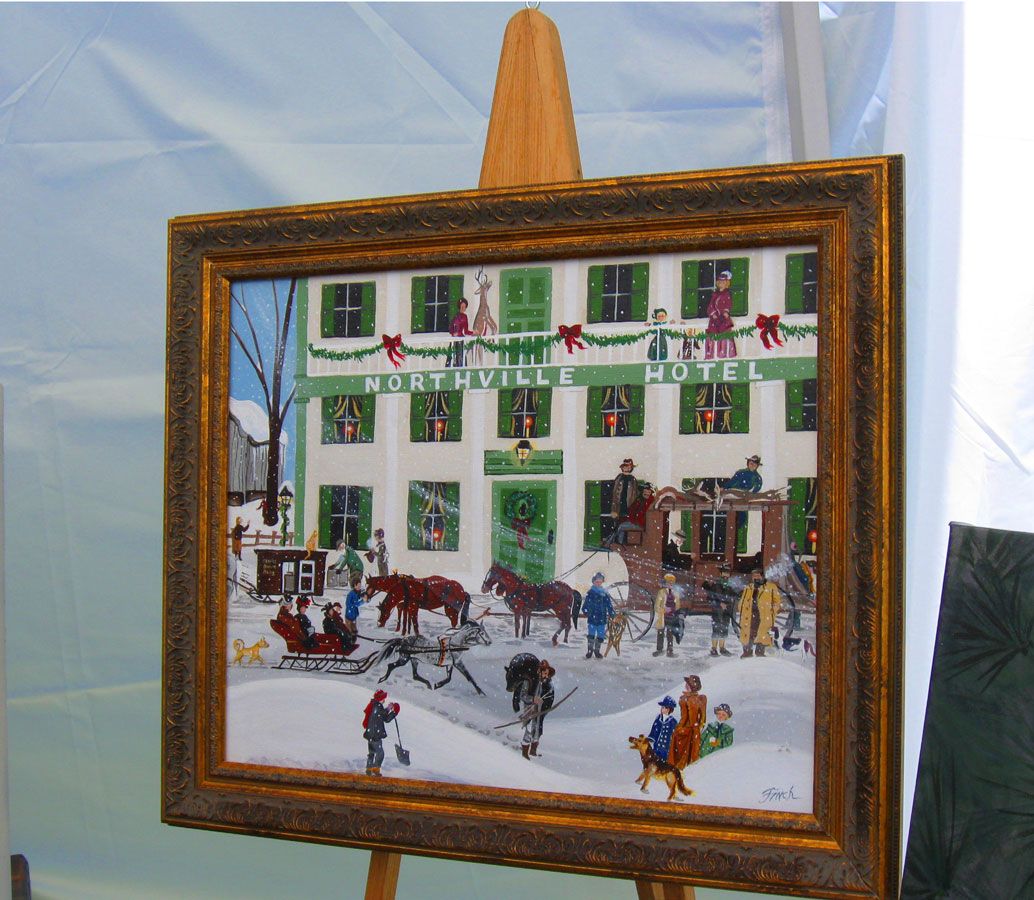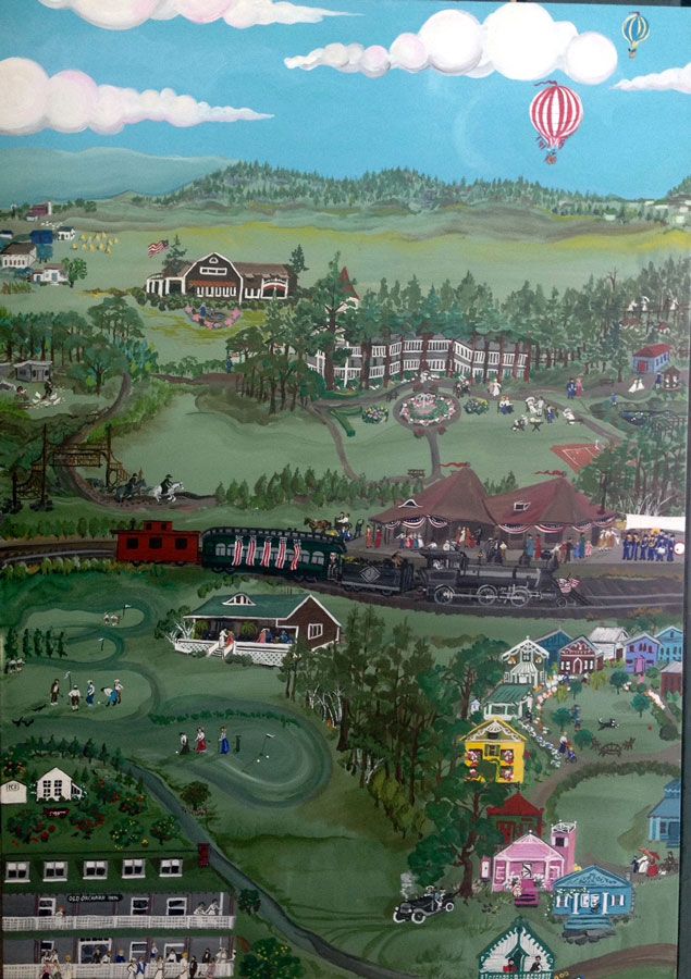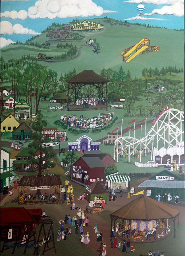 To date, Finch has completed 24 historic Sacandaga Valley folk art scenes, but fresh ideas for additional pieces are always brewing. The artist researches extensively before undertaking a painting, often spending months gathering pertinent and intriguing backstory from old maps, postcards, newspapers, and books. The facts, figures, and old photographs unearthed by Finch and her researching helpmates—including husband Henry Fletcher, daughters Anna and Amanda (both artists themselves), several history buff friends, and seven local historical societies—provide the grist for each of her local paintings.