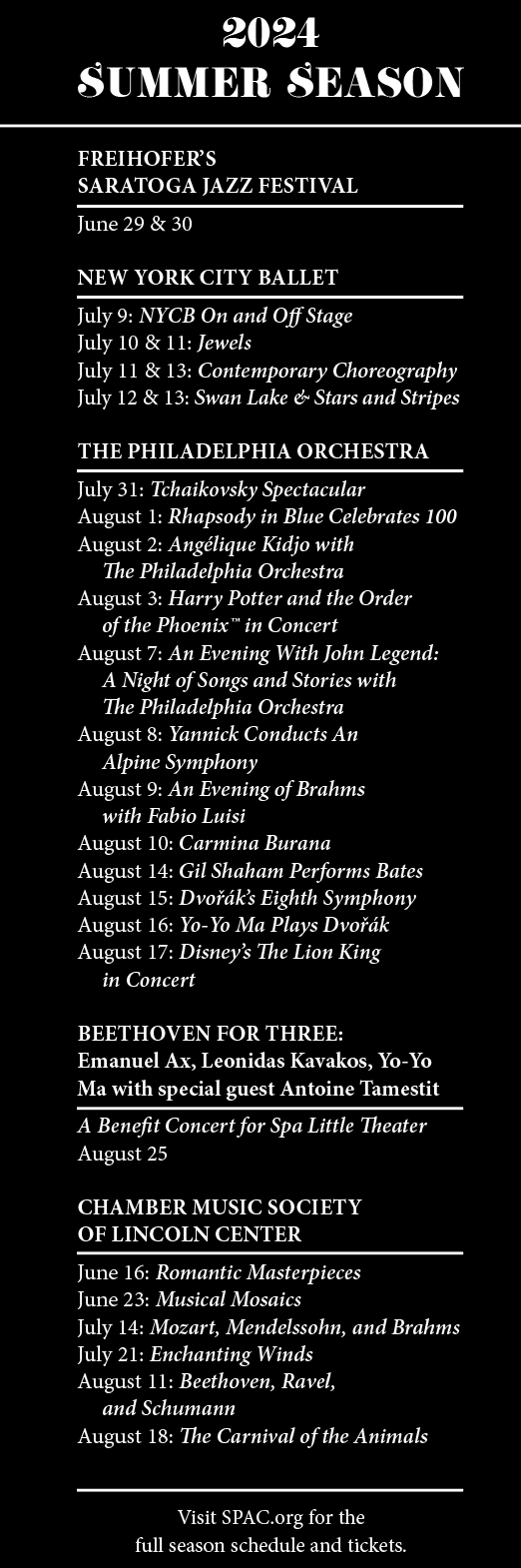 “SPAC has become a destination stage for many of the greatest artists in the world and our 2024 season is no exception. From our great Philadelphia Orchestra featuring appearances by Yo-Yo Ma to John Legend, to our incredible New York City Ballet dancers, this year’s programming offers something for everyone,” said Elizabeth Sobol, SPAC’s President & CEO.