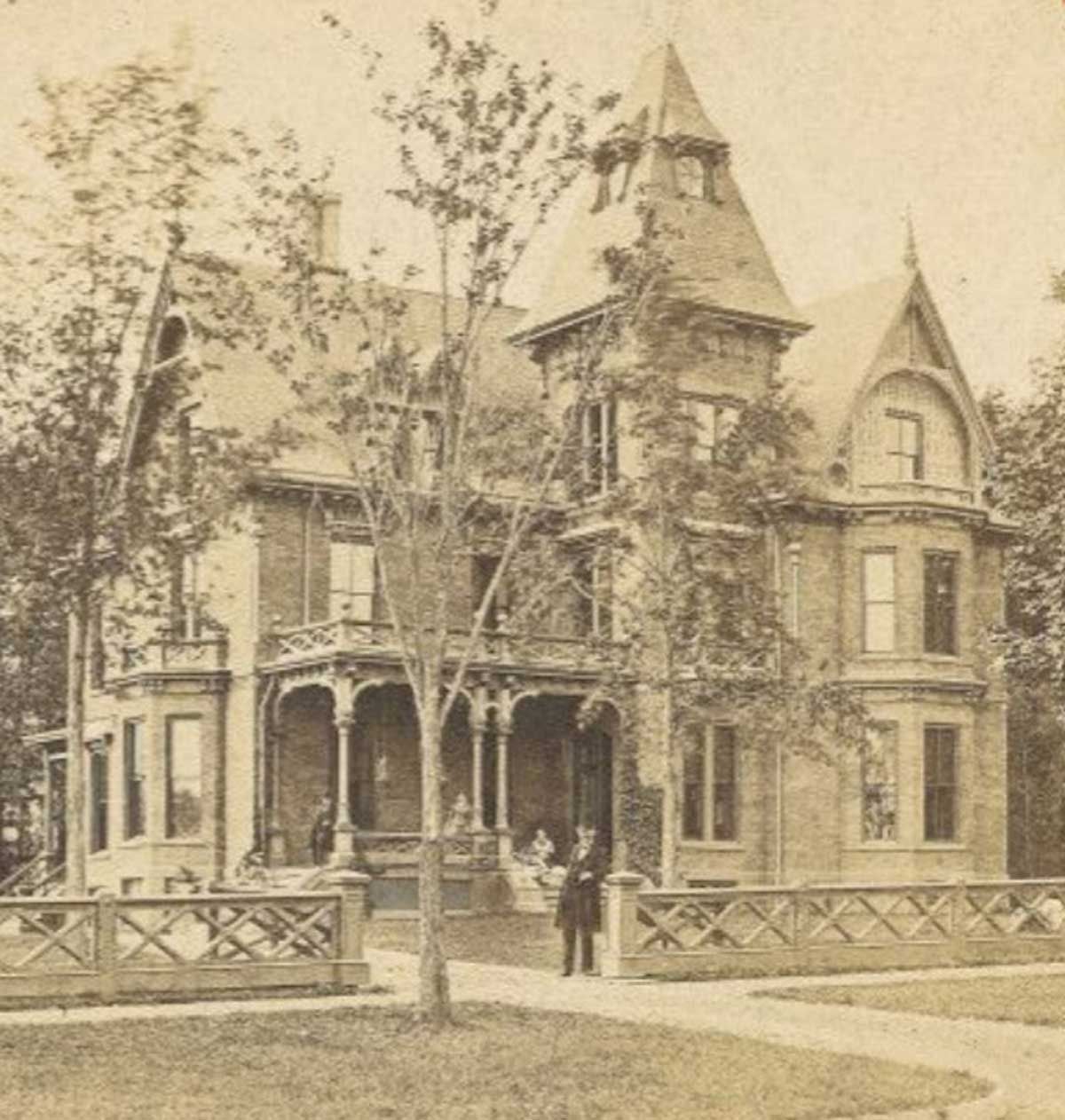 In 1875, after acquiring several vacant lots on North Broadway, Lester built a residence at 747 North Broadway, the most northerly building on North Broadway at the time of construction. The large Stick style brick 22-room house was known as Adirondack Villa. The Stick style, popular between 1860 and 1890, is a transitional style that links the preceding Gothic Revival with the subsequent Queen Anne style. Typical of the style, the house had a steeply pitched roof with exposed eaves, front-facing gable, decorative horseshoe wood trusses at the apex of the gables, a tower, and a porch with cross patterned balustrades. It was here that he and his wife Lucy “entertained their friends with gracious hospitality for many years” according to the Saratogian. When the Lesters constructed a new house at 694 North Broadway, they sold the property to Eliza B. Downing, the wife of Augustus C. Downing, in 1886.