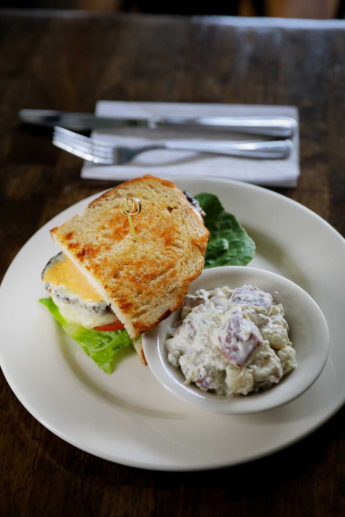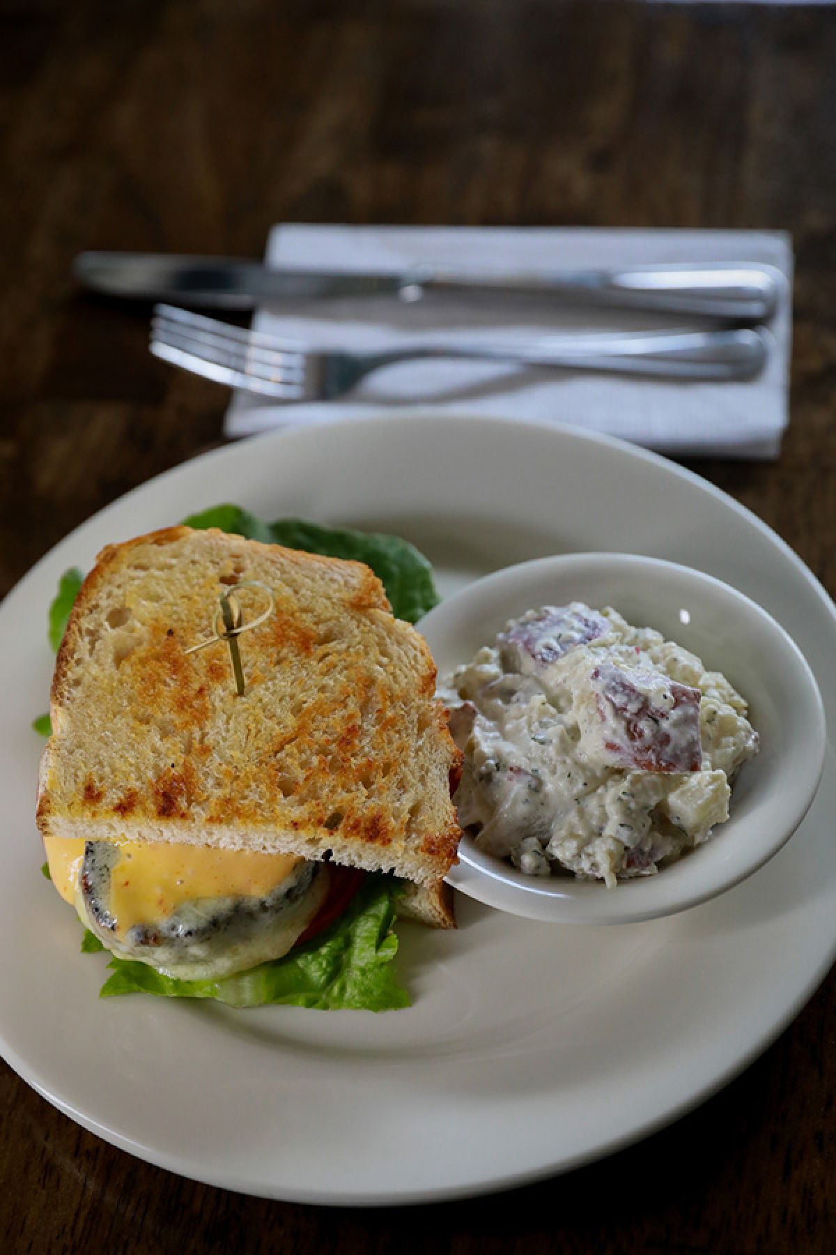 Chris asks what the secret ingredient is in the creamy potato salad that comes with the sandwich. “Potatoes,” Michele says with a chuckle. “The secret ingredient is love, someone calls from the kitchen. She makes it with love.”