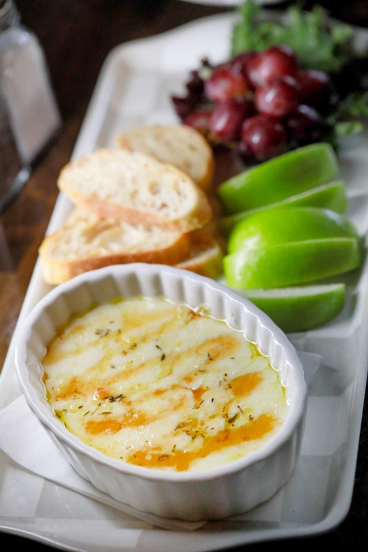 We start with an attractive plate titled Melty Baked Fontina Cheese. This cheese is To. Die. For. —seriously. The fontina cheese is melted and gooey, with a mixture of garlic and herbs. It’s topped with hot honey and served with crispy slices of crostini, sliced green apples, and chilled red grapes.