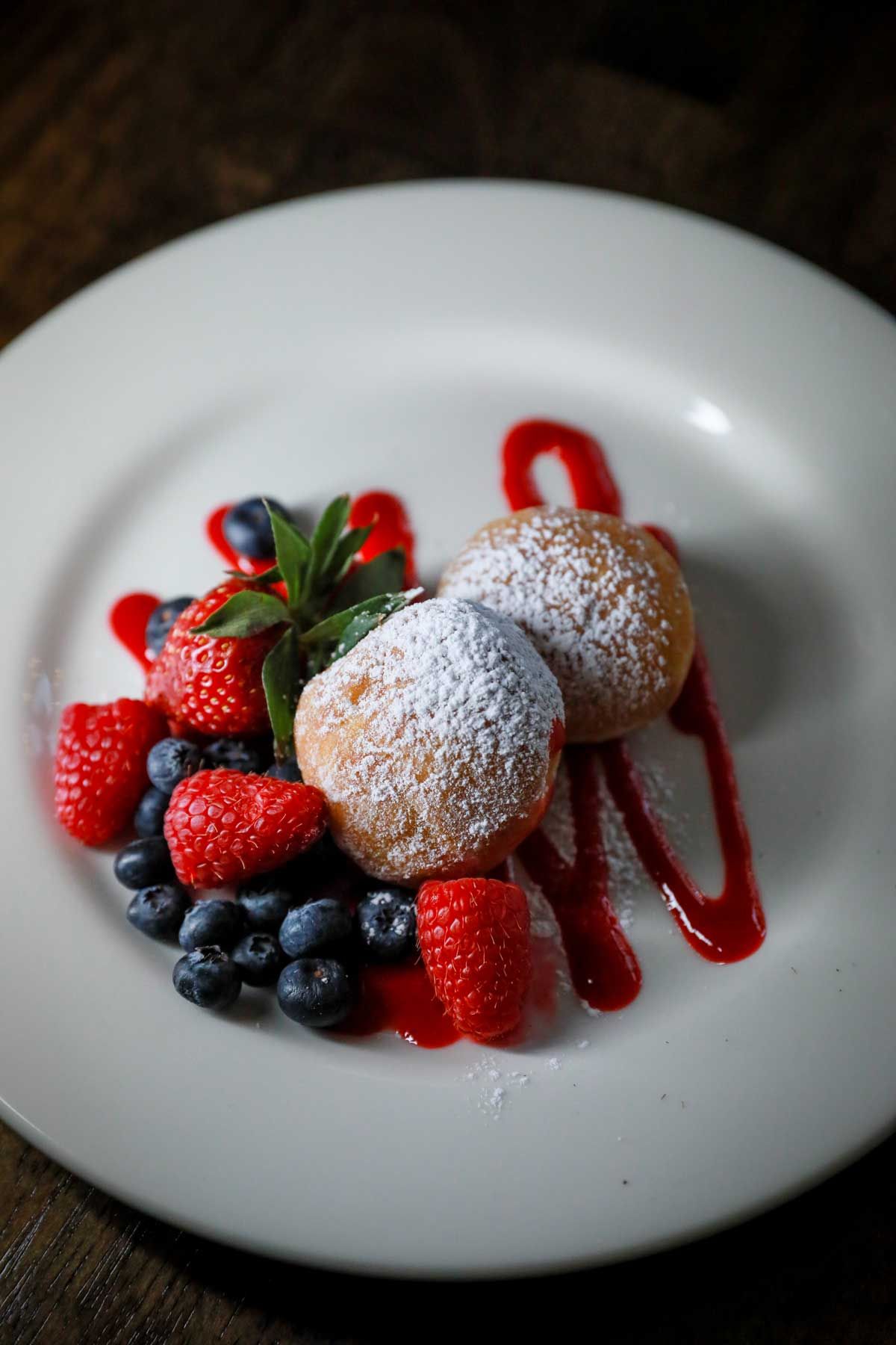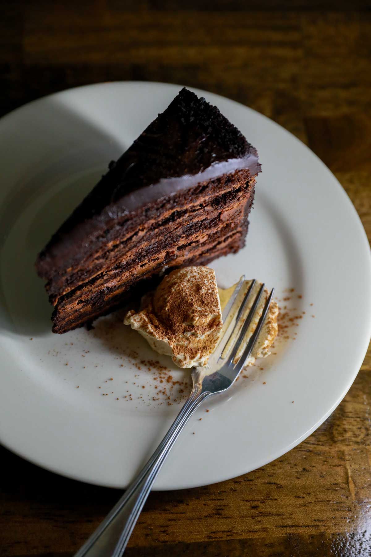 Dessert is ridiculous—honest to God. We tried the Beignets with fresh berries first. They are melt-in-your-mouth scrumptious, and the raspberry glaze is the perfect blend of sweet and tart. Afterward, we shared a slice of chocolate layer cake. (Can you count the layers?!) It tastes like fudge, so moist and decadent. The whipped cream is mocha flavored. Crazy.