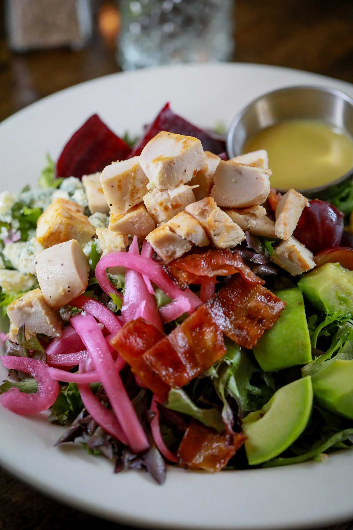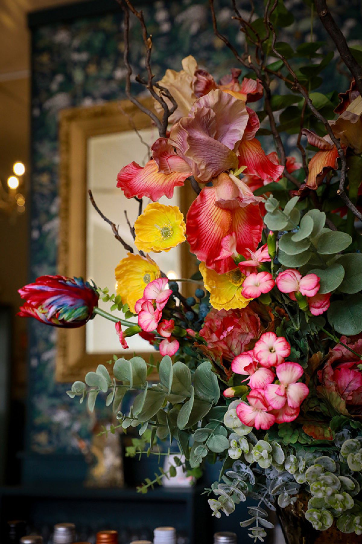 Her voice trails off as we rave about Frank, a fun addition to the wall decorations, and most definitely a conversation piece. “The floral centerpiece on the bar is also fussed over regularly.” Susan has taken several photos, it’s stunning at every angle! “Currently, curly willow, eucalyptus, and colorful blooms are stealing the show.” When we entered the restaurant, Michele was cutting greenery to place inside the humongous vase on the front counter – truly breathtaking!