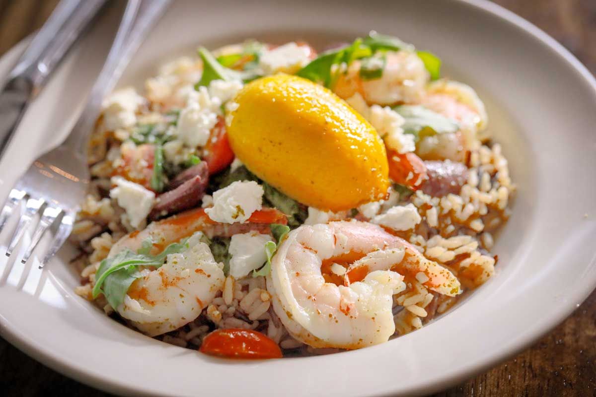 We next share the Mediterranean Shrimp dish. Sauteed in lemon pesto sauce with fresh tomato, Kalamata olives, and arugula, the shrimp comes with wild rice and feta cheese. Again, the flavors are a welcome mix, and we can’t stop raving about how delicious this is!