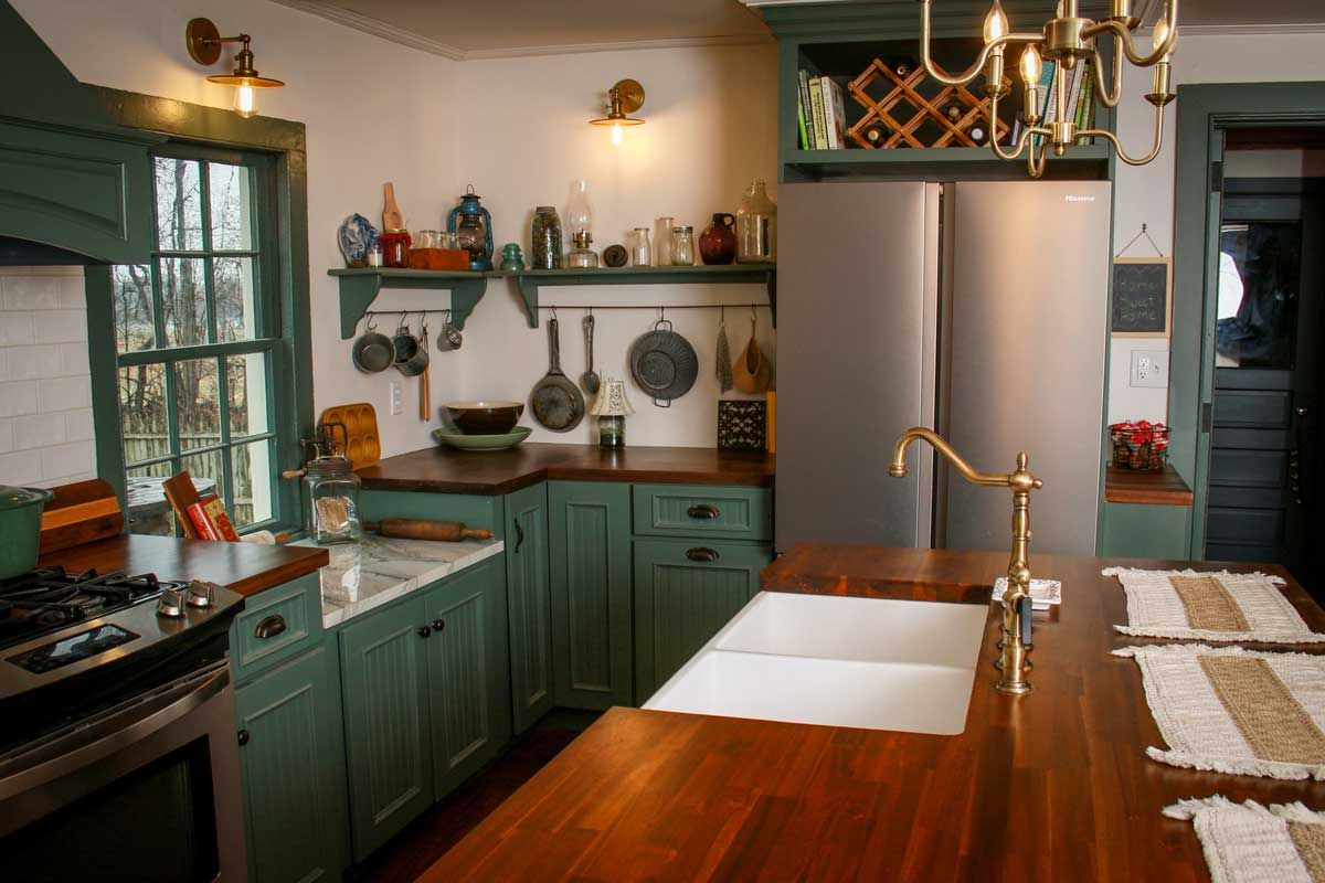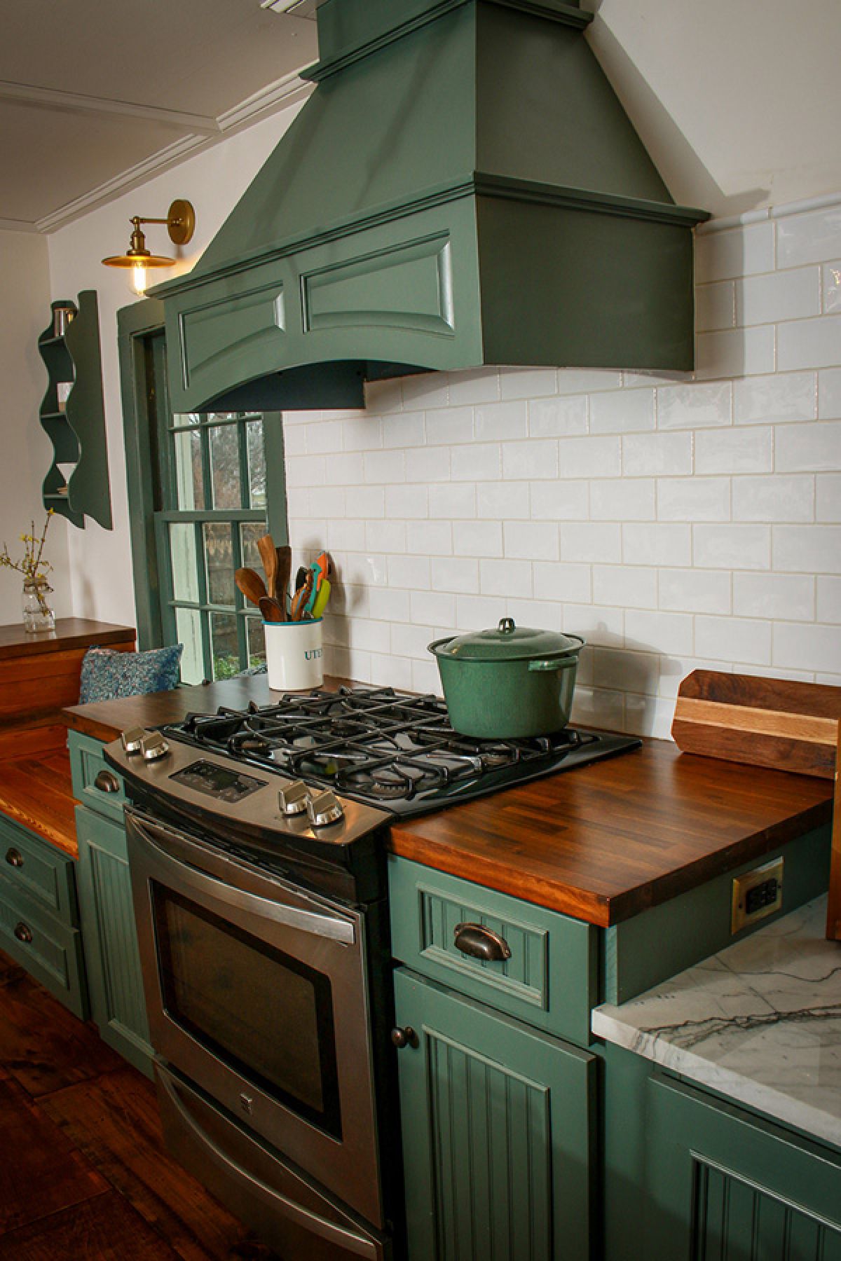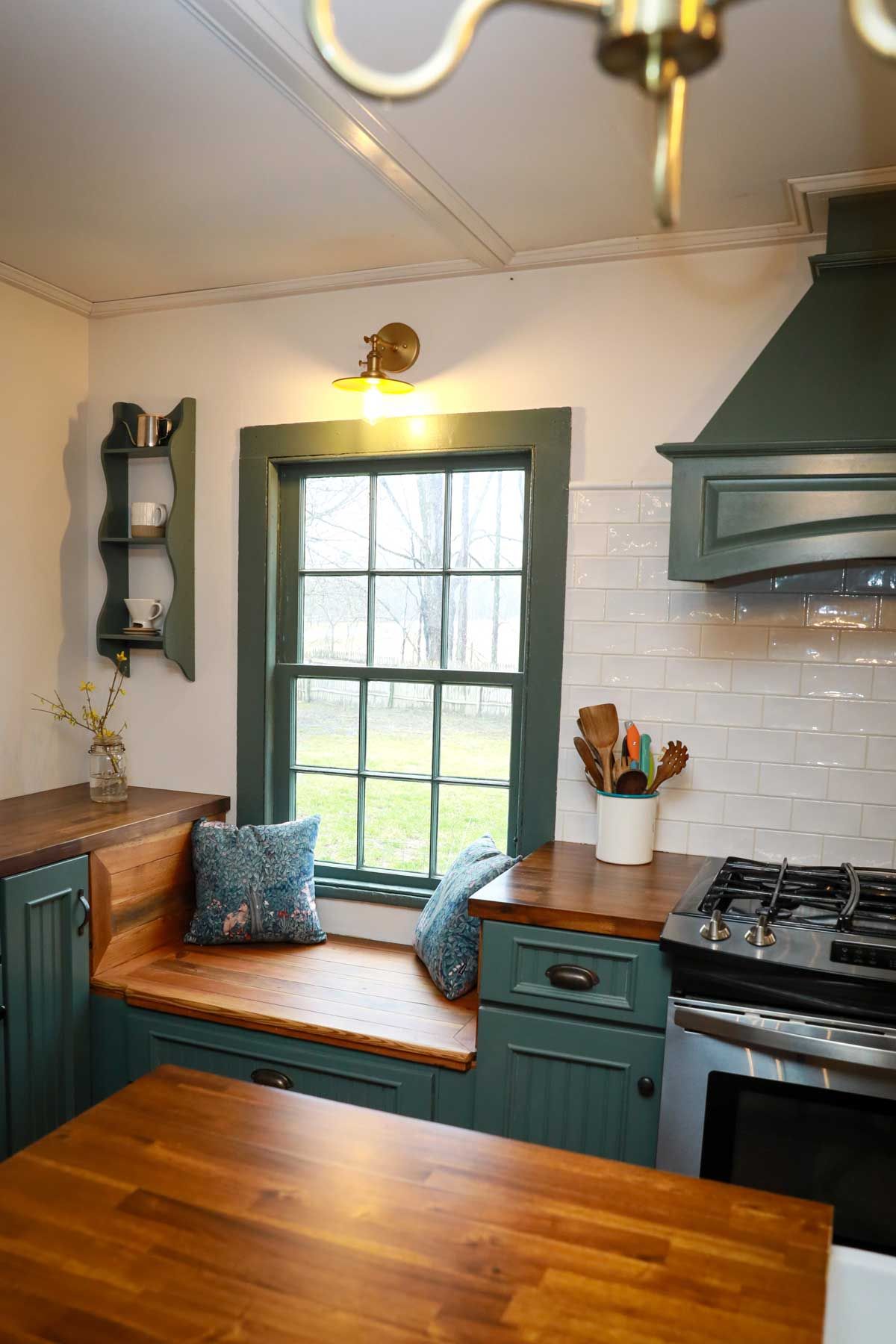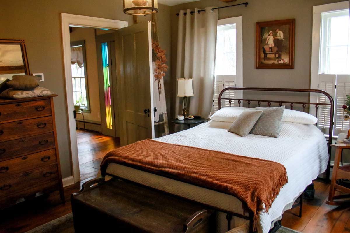 Throughout the 3-bed, 2-bath structure, there isn’t one area that hasn’t been touched, said Allie. They designed the kitchen layout around the home’s wonderful old windows and Allie painstakingly restored each one (with antique glass when available). The kitchen’s custom woodwork includes an endearing window seat, baking station, and pantry. The parlor bedroom is Allie’s favorite space, but Edward has a harder time choosing.