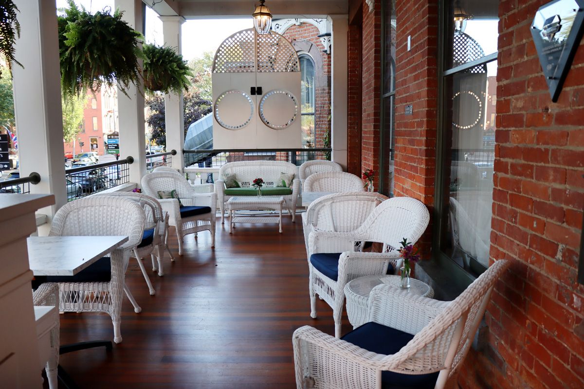 I will say the crown jewel of this hotel is their beautiful wraparound Saratoga porch. It ties everything together with a bow. No matter the time of year, catching sight of it stops anyone walking by in their tracks. You can almost hear it whisper a warm welcome, extending an invitation to walk up the stairs and take a seat, drink a glass of wine or chilled craft beer, and people-watch the day go by. Because it is a common, open space for guests, complemented with wicker furniture, it’s easy to imagine speaking freely to strangers about everyday events, where they’re from, and what brought them to the Spa City.