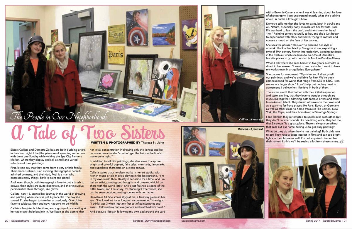 John was around 11, I think, and timid. I still have a photo of him standing in the crook of his mother’s arm—super cute kid. The sisters were standing in front of a display of their artwork, which was exceptional. There are so many outstanding, sensitive youth out there in the world today; I love it when I have a chance to get to know them. I asked if I could interview Callista and Demetra, and my subsequent story came out in the Saratoga Mama Spring issue that same year.
