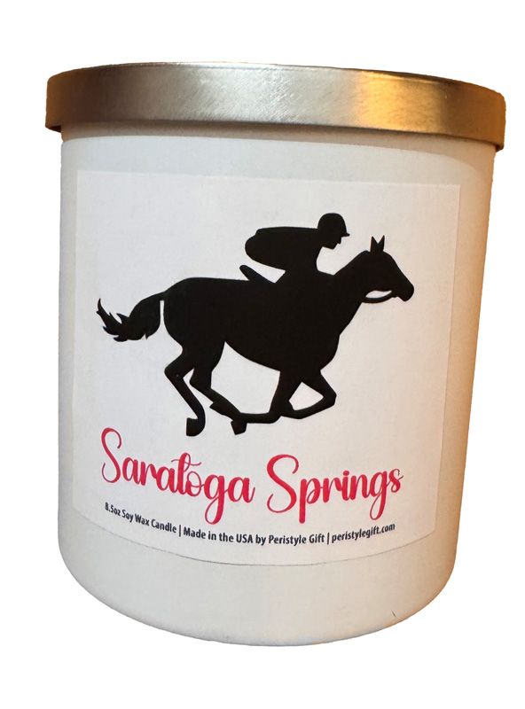 In Malta, be sure to stop in at Finishing Touches where you can source unique one-of-a-kind art pieces by Sandy Garbrandt, a local artist who also just so happens to decorate ice cream pies for Cookies and Cream ice cream shop! Get your order in for one of those at Finishing Touches! The two remaining art pieces are her Colorful Decoupage Horseshoe and Pen & Ink Horse CloseUp. Her attention to detail is so refined that even her decoupage is completed with each tiny piece being layered in place with a toothpick! Don’t miss out on these originals…once they’re gone… they’re gone! And if you’re a candle lover, be sure to pick up their new Saratoga Spring Candle in a ginger-orange scent. Made of 100% soy candle wax and of course…made in the USA! The silhouette jockey on front, running for the finish line, puts an exclamation on any Saratoga décor!