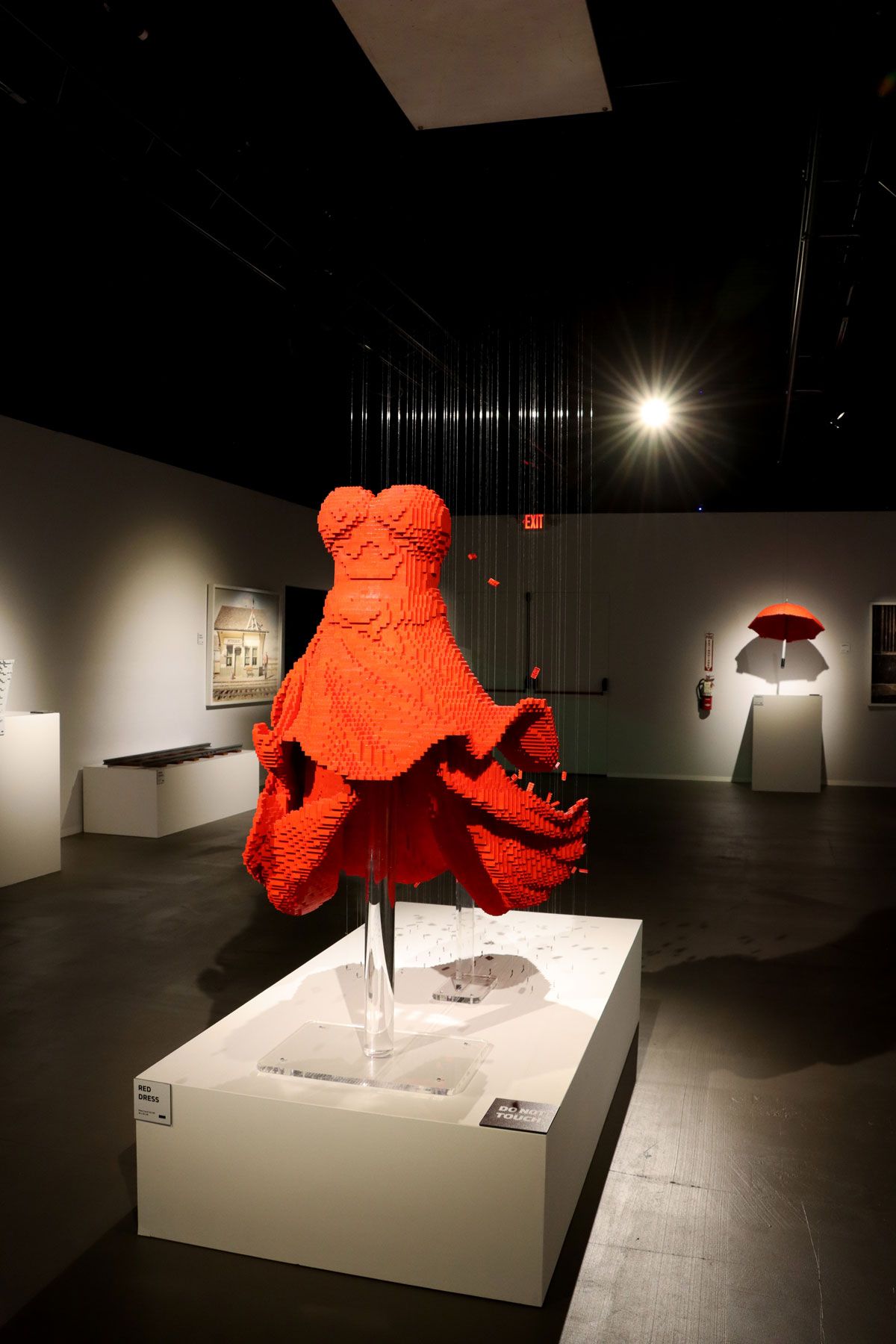 I think my favorite part was a collaboration between Sawaya and the award-winning photographer, Dean West. In one room, framed photographs hung on the wall. It was wonderful to see such a diverse and eye-catching selection of pieces. Next to them, the LEGO artist had pulled out one ‘piece’ of the image and created it with the bricks. For instance, one shows what appears to be a movie theater. The film playing is ‘On the Run.’ And there is a woman out front, walking (or running) in a bright red dress that is billowing around her. Nathan took the idea of the dress, built it from bright red LEGOs, and hung it from the ceiling. It’s astounding, to say the least, as you can feel the fluid motion, even though it is a static piece. In another, he created a brown and tan bath towel and flip flops, items inspired by a photo showing a man at the edge of a pool, ready to test the waters.