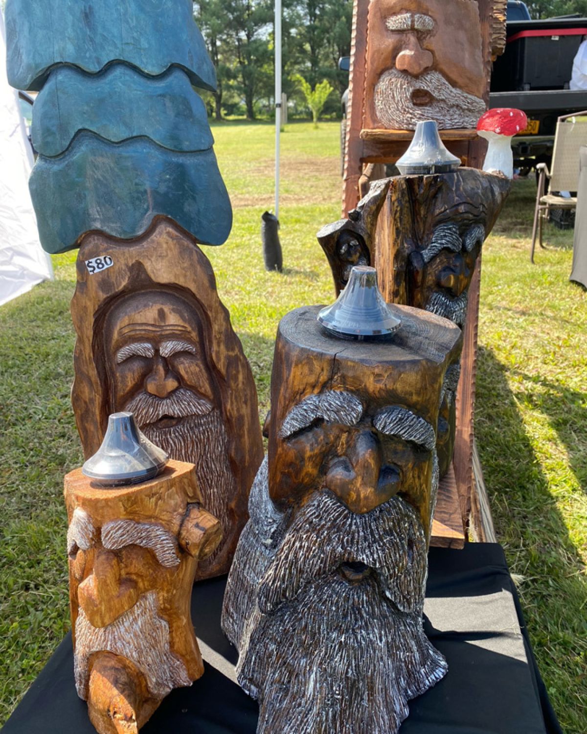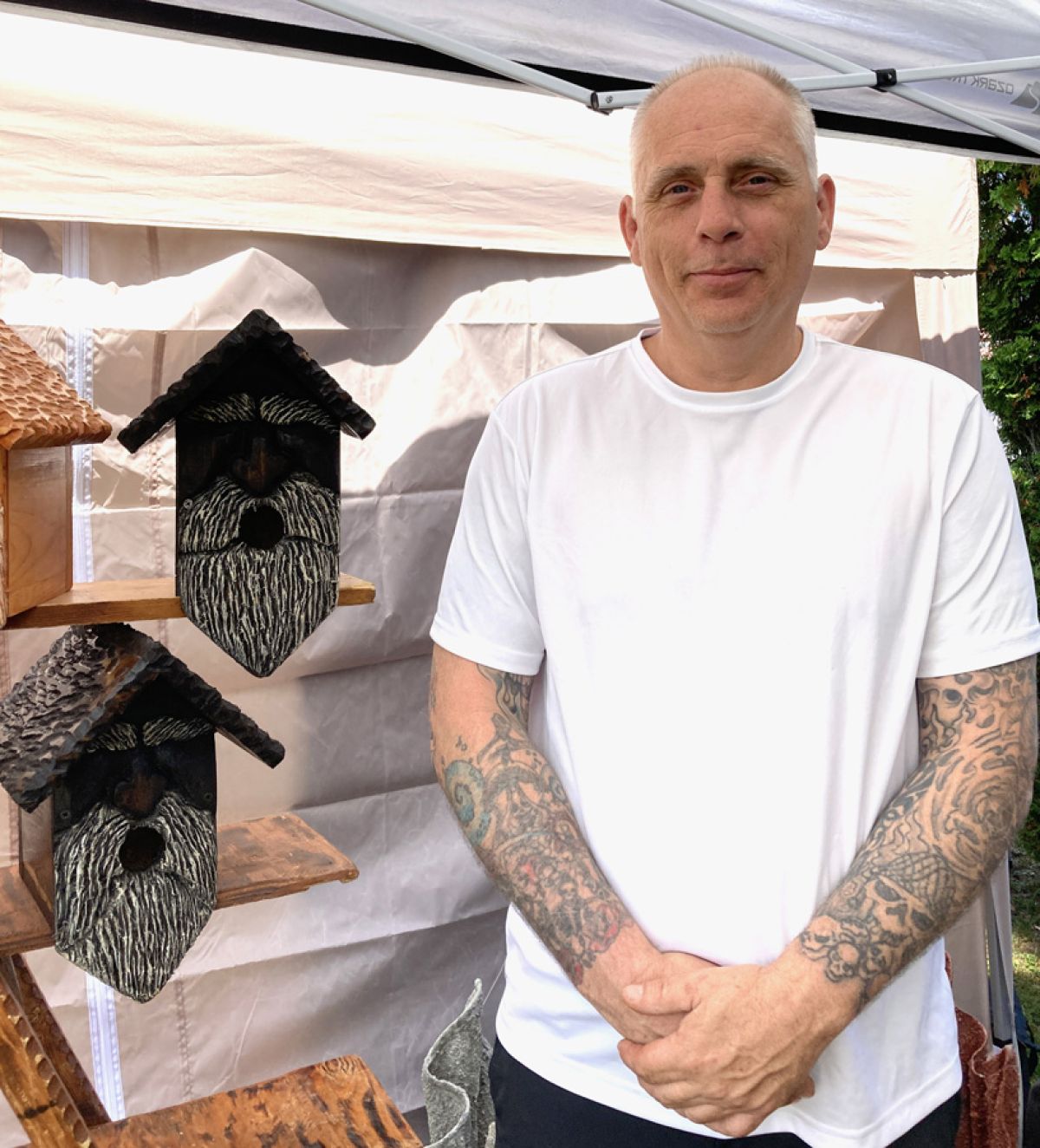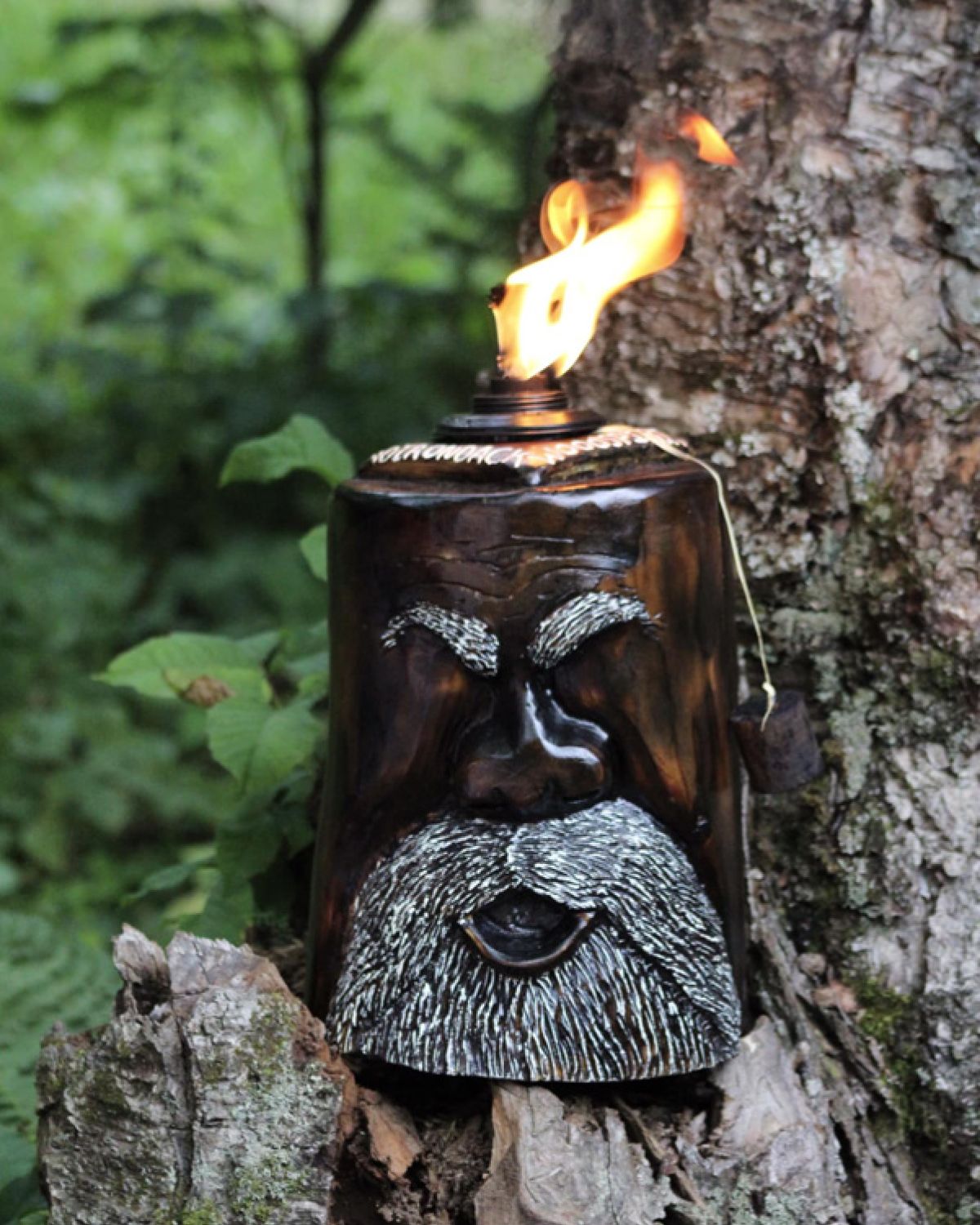 After initially donating his carvings to local animal shelters to aid their fundraising efforts, Holland was blown away when people began contacting him, wanting to purchase a piece. Although his wood spirit birdhouses and walking sticks are top sellers, Holland’s inventory gradually has grown to include gnomes, tiki torches, lamps, planters, solar fountains, and another fan favorite: ‘stumpkins.’