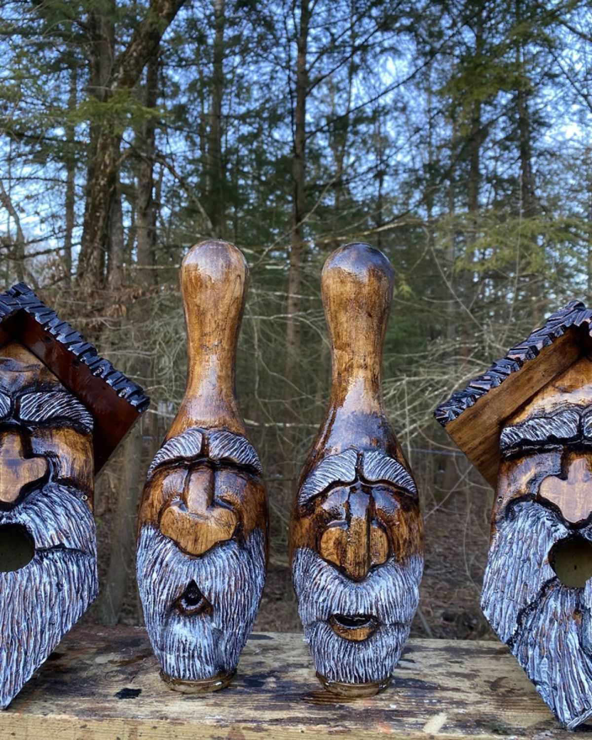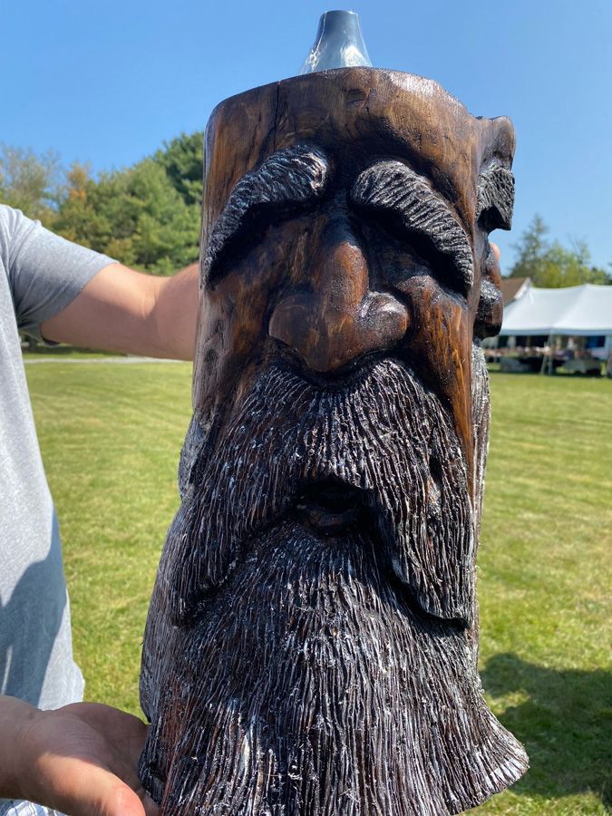 This totally unexpected pivot led Holland to begin Adirondack WoodSpirits, an all-new and unique business venture in which he carves imaginative wood spirit faces on birdhouses, walking sticks, furniture, and more. “My fiancée and I were watching a YouTube video about carving wood spirits,” he says, “and she suggested I try making one out of this nice piece of driftwood I’d found along the Sacandaga. I gave carving a try and found that I really enjoyed it.”