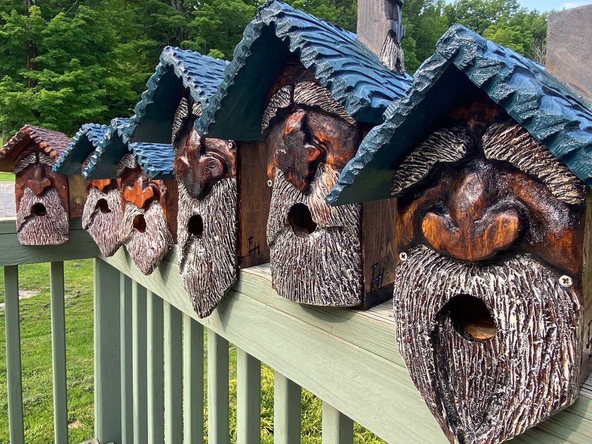 Adirondack WoodSpirits birdhouses with Holland's signature roof hatching.