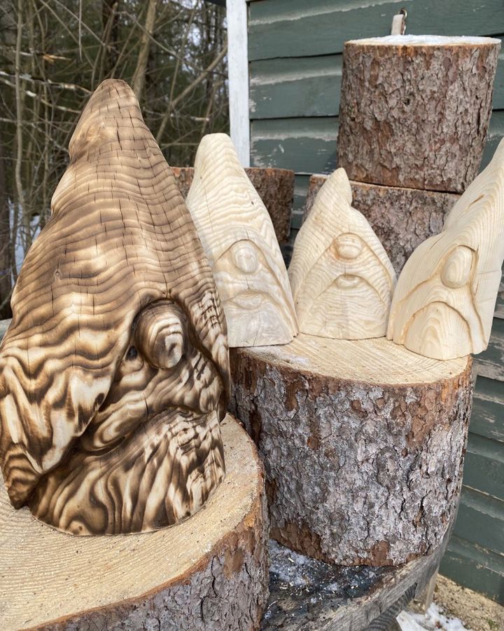 “I really enjoy salvaging and repurposing wood. Buy a board at the store, and it’s just a board. But you find something lying around or something that’s been floating around in the river, and it has a distinctive shape that you’ll never find again. As I’m carving each piece of wood, I often think about where it came from and what its story might be. Even a unique piece with a natural crack may be transformed into one wood spirit eye emerging from the wood. The possibilities are endless. You just have to use your imagination and work with each individual piece.”