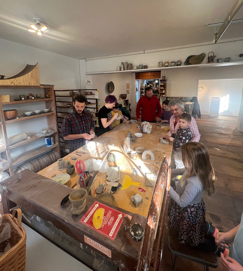 Jordan tells me he hosted a weekend workshop in early February for 40 parents, teachers, and students from the Waldorf School of Saratoga, where his kids attend classes. “It’s interesting to watch how parents approach working with clay for the first time vs. how children do,” he elaborates. “During this particular weekend, participants could work on a sculptural project with clay or watch a live demo on the potter’s wheel while the younger ones happily created an imaginary clay land on a low table I’d set up the night before. Each group of children that worked their way through the shop kept adding to the village throughout the event. It was magical.”