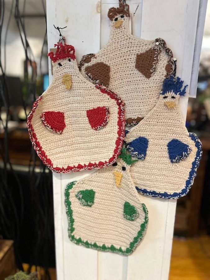 Our Eggs on the Run food trailer may be closed for the season but we still have Eggcellent Gifts, like our chicken pot holders!!